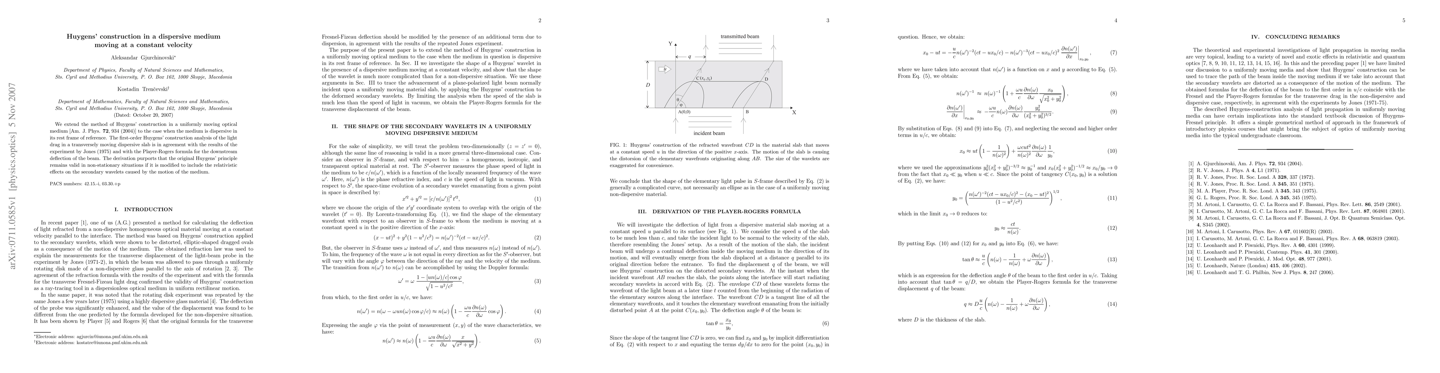 This paper extends Huygens' construction to dispersive media moving at a constant velocity, showing agreement with experimental results and the Player-Rogers formula for light beam deflection. It modifies the original Huygens' principle to incorporate relativistic effects due to the medium's motion.