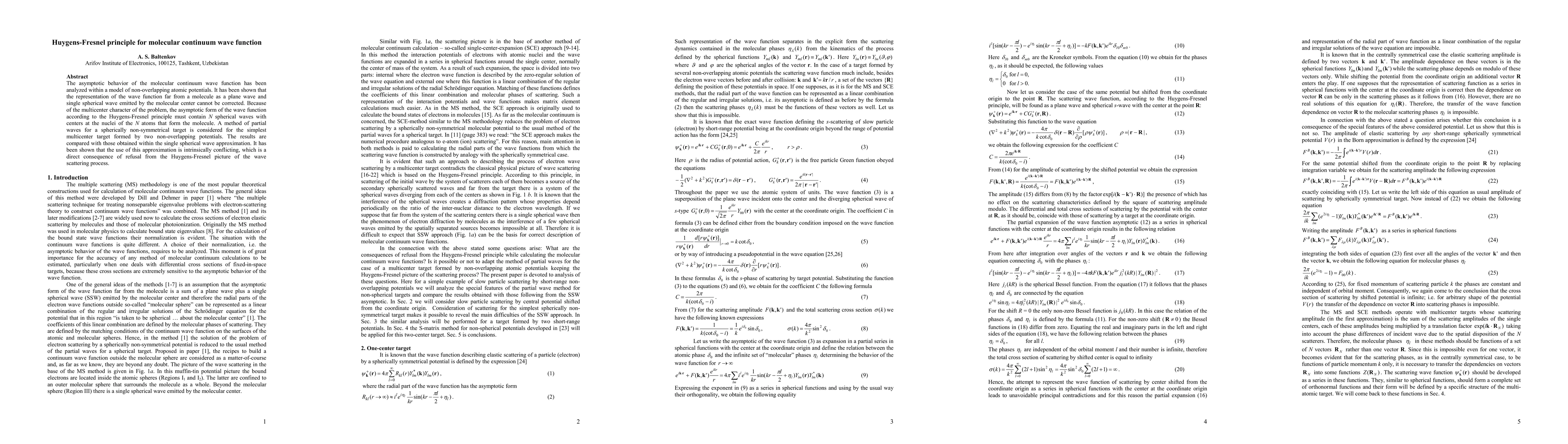 The asymptotic behavior of the molecular continuum wave function has been analyzed within a model of non-overlapping atomic potentials. It has been shown that the representation of the wave function far from a molecule as a plane wave and single spherical wave emitted by the molecular center cannot be corrected. Because of the multicenter character of the problem, the asymptotic form of the wave function according to the Huygens-Fresnel principle must contain N spherical waves with centers at the nuclei of the N atoms that form the molecule. A method of partial waves for a spherically non-symmetrical target is considered for the simplest multicenter target formed by two non-overlapping potentials. The results are compared with those obtained within the single spherical wave approximation. It has been shown that the use of this approximation is intrinsically conflicting, which is a direct consequence of refusal from the Huygens-Fresnel picture of the wave scattering process.