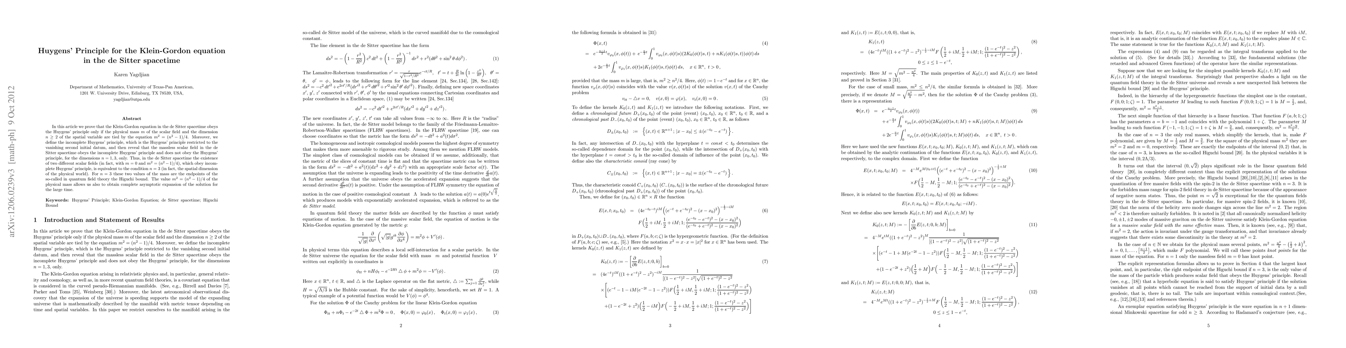 This paper proves that the Klein-Gordon equation in de Sitter spacetime obeys Huygens' principle under the condition $m^2=(n^2-1)/4$ for $n\geq 2$. It also introduces the incomplete Huygens' principle, showing that the massless scalar field obeys it only for $n=1,3$, and discusses the significance of $n=3$ in relation to the Higuchi bound.