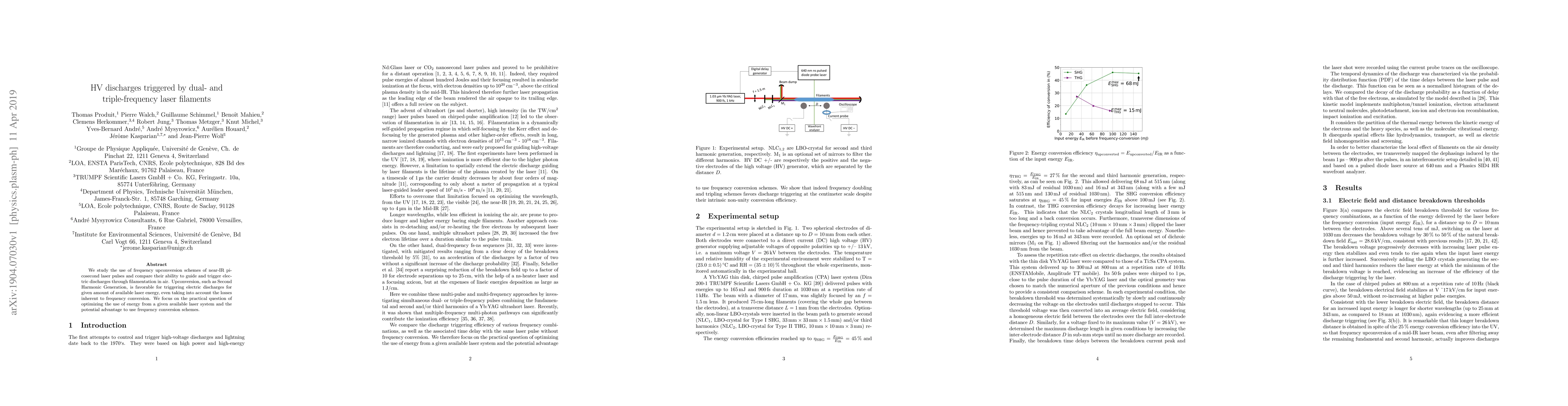 We study the use of frequency upconversion schemes of near-IR picosecond laser pulses and compare their ability to guide and trigger electric discharges through filamentation in air. Upconversion, such as Second Harmonic Generation, is favorable for triggering electric discharges for given amount of available laser energy, even taking into account the losses inherent to frequency conversion. We focus on the practical question of optimizing the use of energy from a given available laser system and the potential advantage to use frequency conversion schemes.