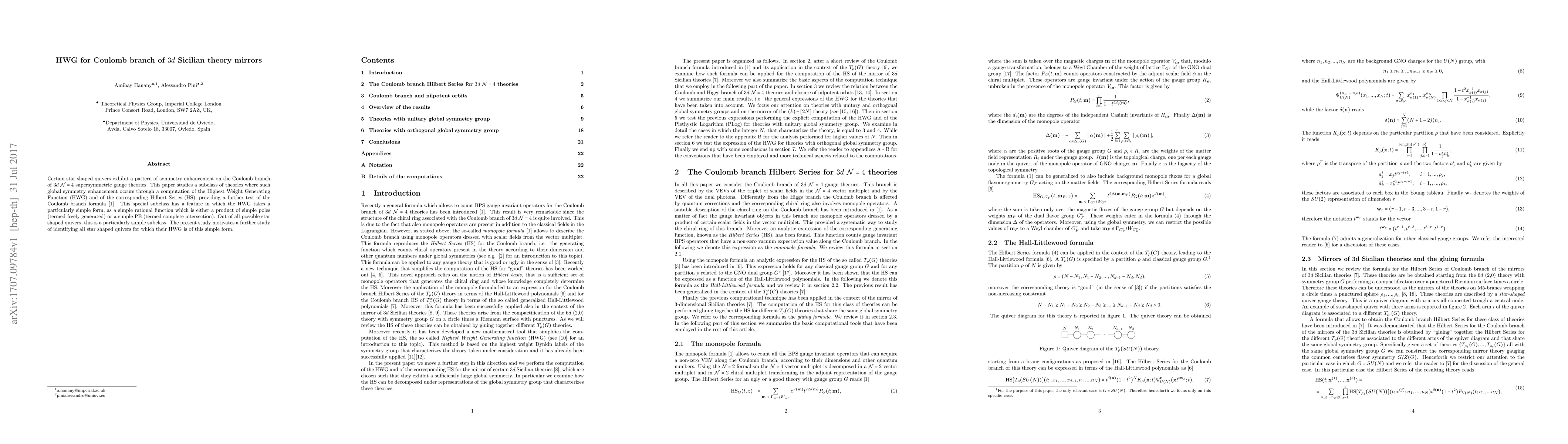 Certain star shaped quivers exhibit a pattern of symmetry enhancement on the Coulomb branch of $3d$ $\mathcal{N}=4$ supersymmetric gauge theories. This paper studies a subclass of theories where such global symmetry enhancement occurs through a computation of the Highest Weight Generating Function (HWG) and of the corresponding Hilbert Series (HS), providing a further test of the Coulomb branch formula. This special subclass has a feature in which the HWG takes a particularly simple form, as a simple rational function which is either a product of simple poles (termed freely generated) or a simple PE (termed complete intersection). Out of all possible star shaped quivers, this is a particularly simple subclass. The present study motivates a further study of identifying all star shaped quivers for which their HWG is of this simple form.