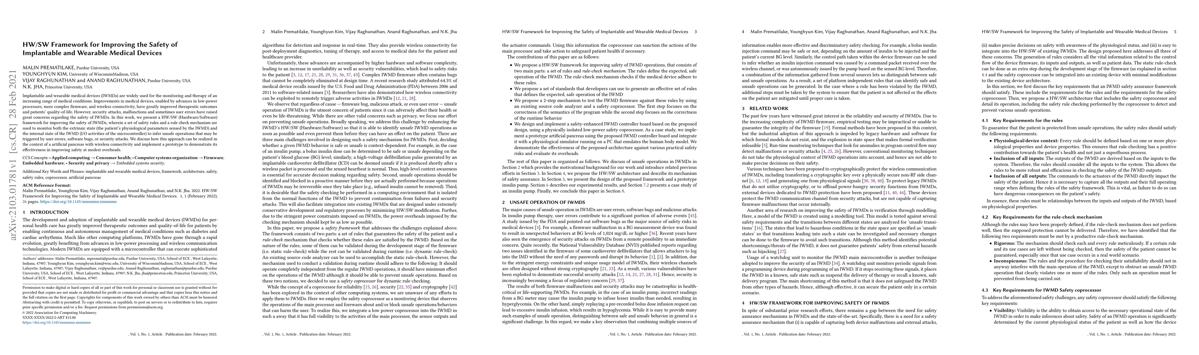 This paper proposes a HW/SW framework to enhance the safety of implantable and wearable medical devices (IWMDs) by monitoring both external physiological parameters and internal microcontroller activities to detect unsafe operations. A prototype implementation for an artificial pancreas demonstrates the framework's effectiveness with minimal performance overhead.