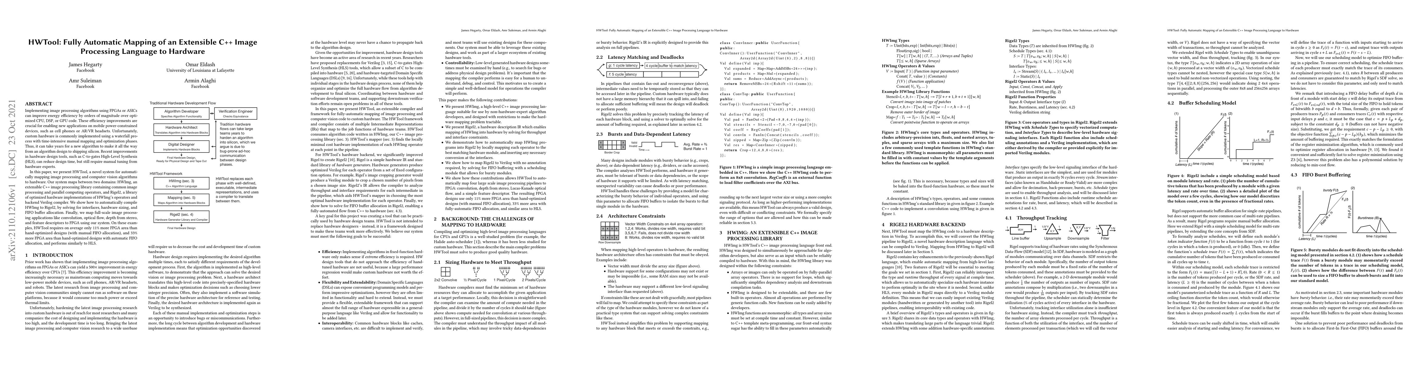 HWTool automates the mapping of C++ image processing algorithms to hardware, significantly reducing design time and improving energy efficiency compared to traditional CPU, DSP, or GPU implementations. The system achieves competitive hardware resource usage compared to hand-optimized designs, demonstrating its potential to accelerate the development of power-efficient image processing applications for mobile devices.