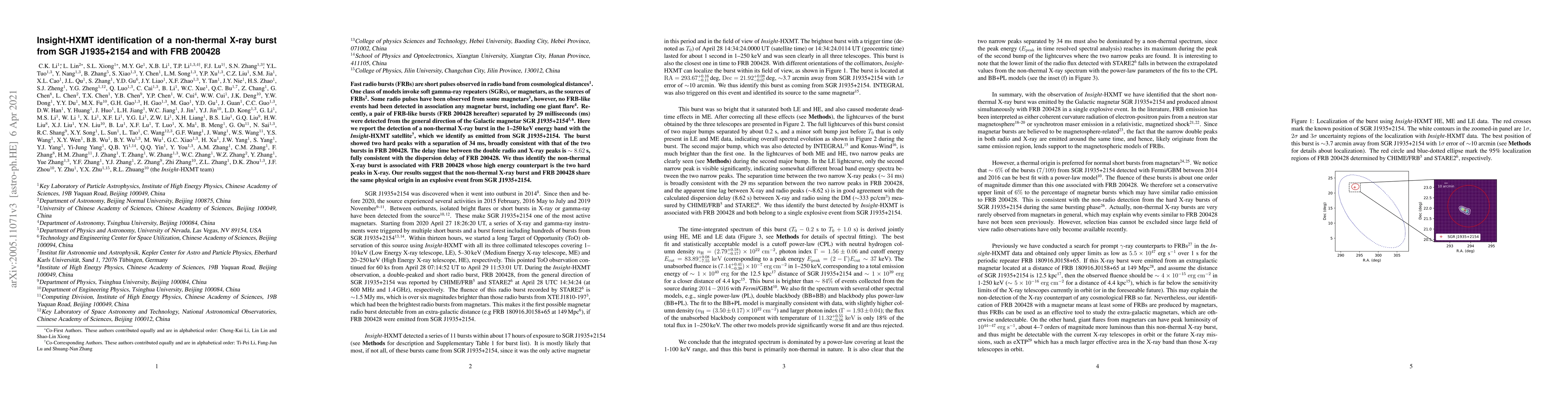 The Insight-HXMT satellite detected a non-thermal X-ray burst from SGR J1935+2154, showing two hard peaks with a separation of 34 ms, consistent with the timing of FRB 200428. This suggests a shared physical origin for the X-ray burst and FRB 200428, indicating an explosive event from the magnetar.