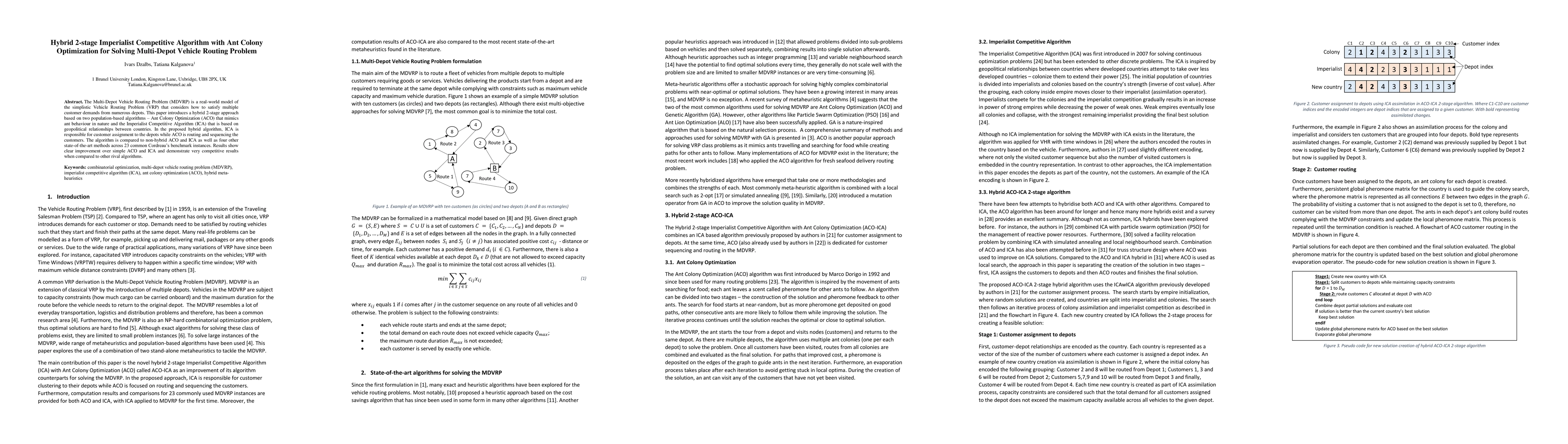 This paper proposes a hybrid 2-stage algorithm combining Ant Colony Optimization (ACO) and the Imperialist Competitive Algorithm (ICA) for solving the Multi-Depot Vehicle Routing Problem (MDVRP). ICA assigns customers to depots, while ACO optimizes routing and sequencing, showing superior performance compared to standalone ACO and ICA and other state-of-the-art methods.