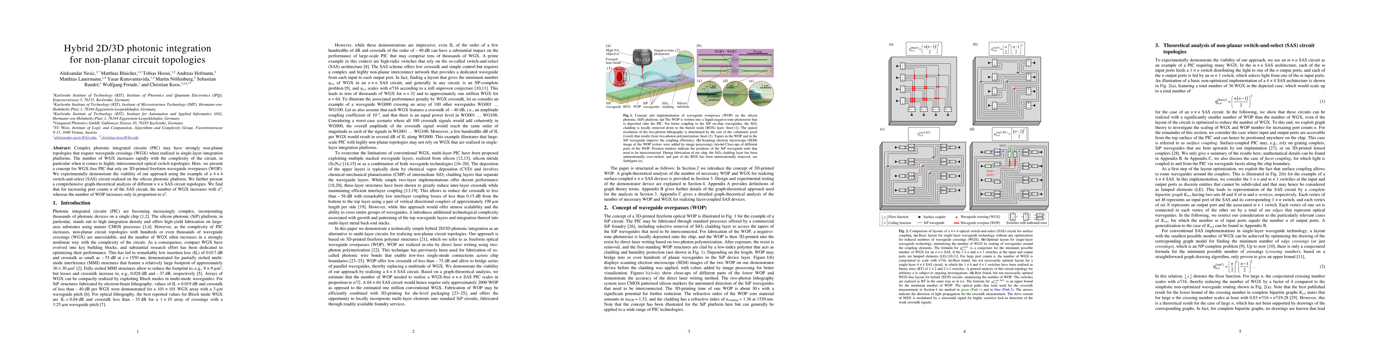 The paper proposes a hybrid 2D/3D photonic integration technique using 3D-printed waveguide overpasses to eliminate waveguide crossings in complex non-planar PICs. Experimentally demonstrated through a $4 \times 4$ switch-and-select circuit, the method significantly reduces waveguide crossings, with their number scaling as $n^4$ and overpasses scaling as $n^2$ with port count $n$.