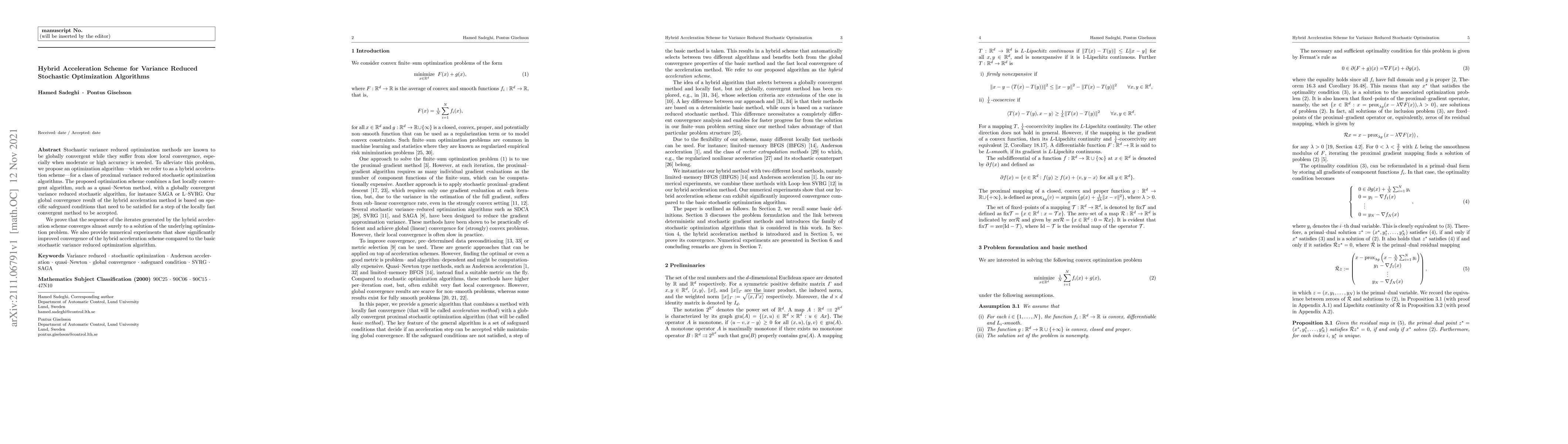 This paper proposes a hybrid acceleration scheme combining a fast locally convergent quasi-Newton method with a globally convergent variance reduced stochastic optimization algorithm like SAGA or L-SVRG to improve local convergence rates. The hybrid method ensures global convergence under specific conditions, and numerical experiments show its superior convergence performance.
