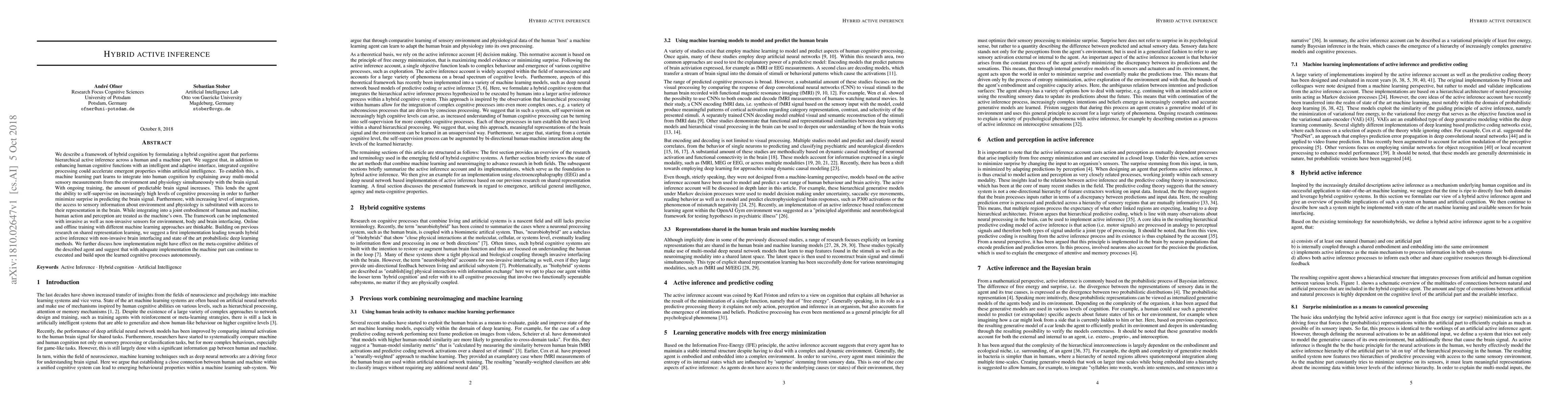We describe a framework of hybrid cognition by formulating a hybrid cognitive agent that performs hierarchical active inference across a human and a machine part. We suggest that, in addition to enhancing human cognitive functions with an intelligent and adaptive interface, integrated cognitive processing could accelerate emergent properties within artificial intelligence. To establish this, a machine learning part learns to integrate into human cognition by explaining away multi-modal sensory measurements from the environment and physiology simultaneously with the brain signal. With ongoing training, the amount of predictable brain signal increases. This lends the agent the ability to self-supervise on increasingly high levels of cognitive processing in order to further minimize surprise in predicting the brain signal. Furthermore, with increasing level of integration, the access to sensory information about environment and physiology is substituted with access to their representation in the brain. While integrating into a joint embodiment of human and machine, human action and perception are treated as the machine's own. The framework can be implemented with invasive as well as non-invasive sensors for environment, body and brain interfacing. Online and offline training with different machine learning approaches are thinkable. Building on previous research on shared representation learning, we suggest a first implementation leading towards hybrid active inference with non-invasive brain interfacing and state of the art probabilistic deep learning methods. We further discuss how implementation might have effect on the meta-cognitive abilities of the described agent and suggest that with adequate implementation the machine part can continue to execute and build upon the learned cognitive processes autonomously.