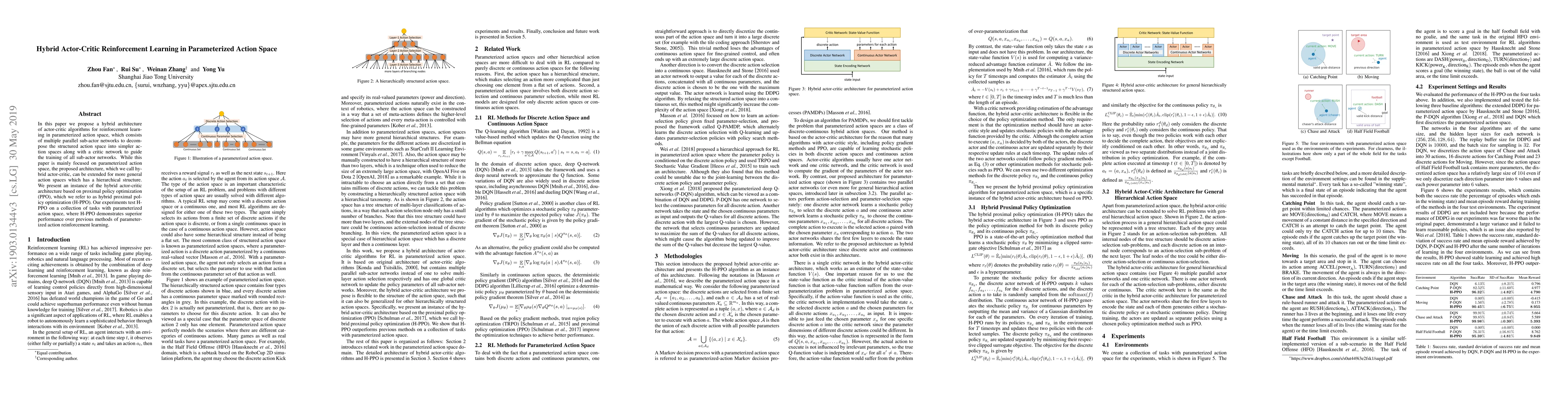 This paper introduces a hybrid actor-critic reinforcement learning architecture, called hybrid proximal policy optimization (H-PPO), which utilizes multiple sub-actor networks to handle parameterized action spaces more efficiently, achieving better performance compared to existing methods. The proposed framework can be extended to hierarchical action spaces.