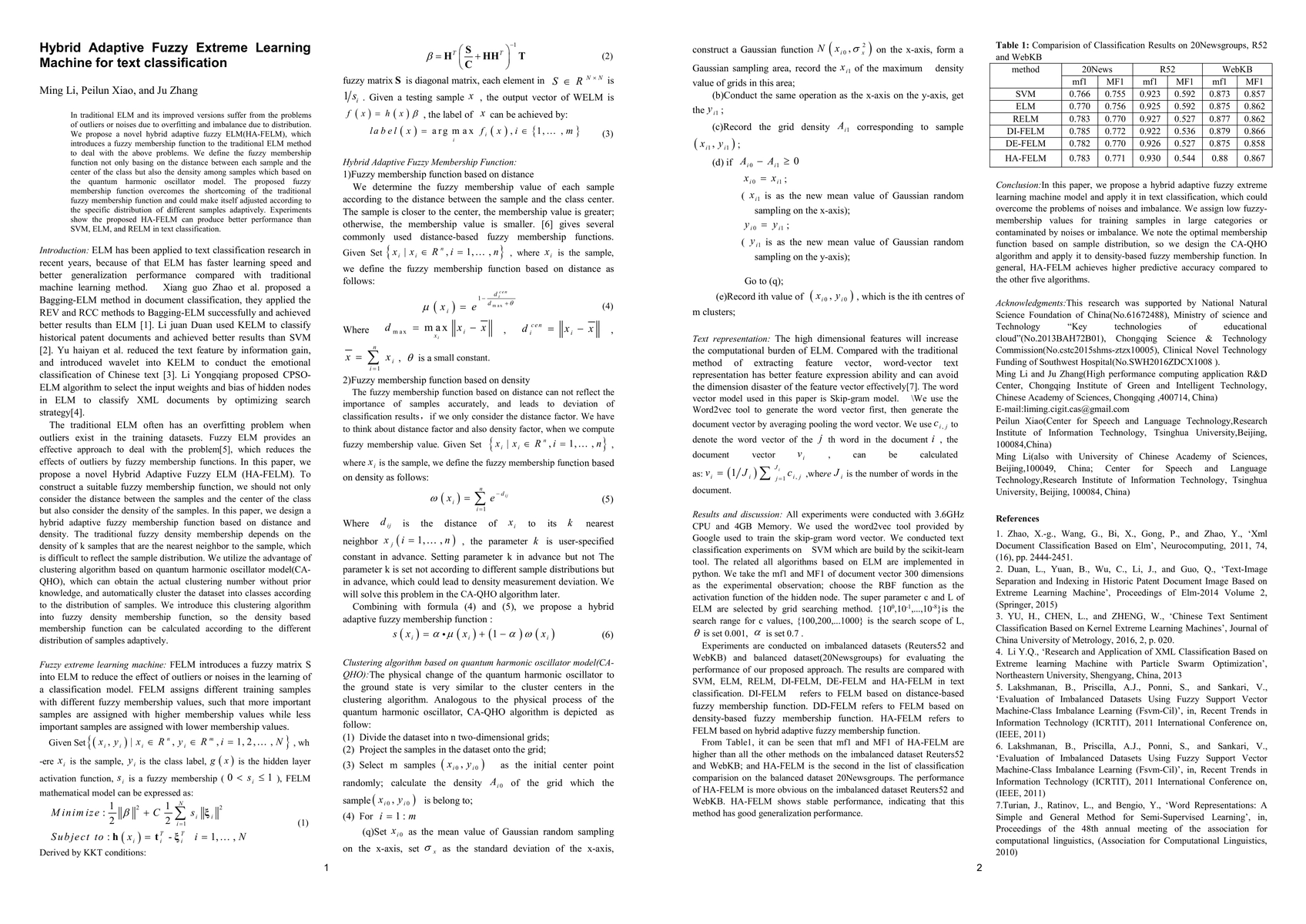 A new hybrid adaptive fuzzy ELM method is proposed to improve text classification performance by addressing overfitting and imbalance issues. The approach introduces a novel fuzzy membership function based on the quantum harmonic oscillator model, leading to better results compared to traditional methods.