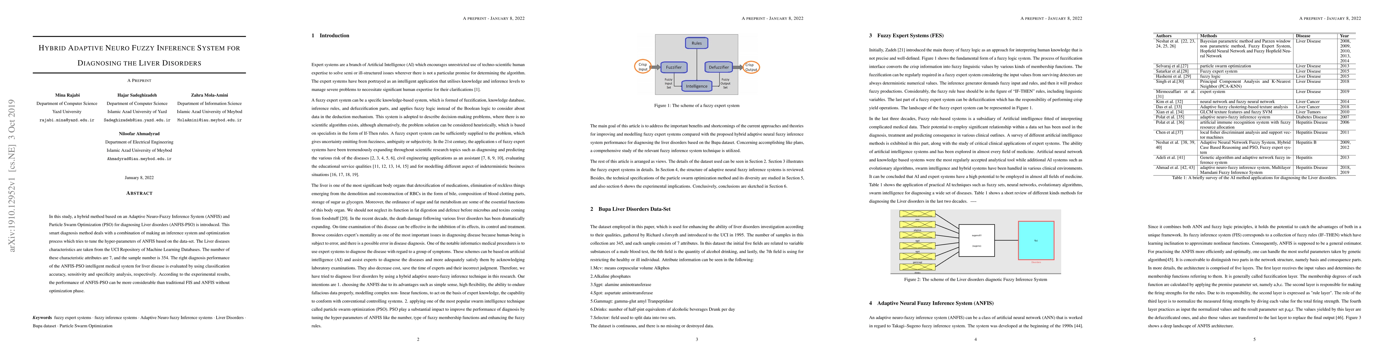 This paper introduces a hybrid Adaptive Neuro-Fuzzy Inference System (ANFIS) optimized by Particle Swarm Optimization (PSO) for diagnosing liver disorders. The ANFIS-PSO method outperforms traditional FIS and ANFIS in terms of classification accuracy, sensitivity, and specificity.