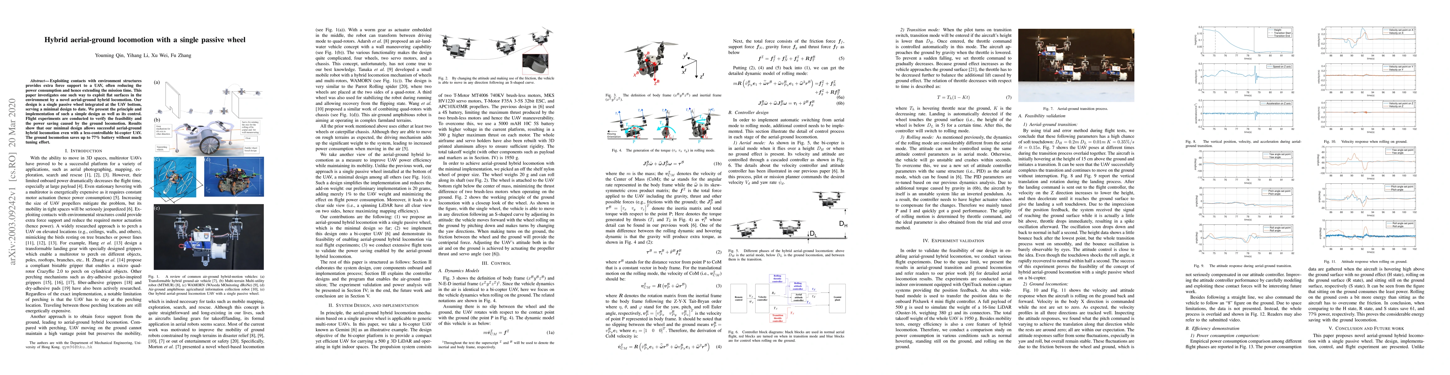 Exploiting contacts with environment structures provides extra force support to a UAV, often reducing the power consumption and hence extending the mission time. This paper investigates one such way to exploit flat surfaces in the environment by a novel aerial-ground hybrid locomotion. Our design is a single passive wheel integrated at the UAV bottom, serving a minimal design to date. We present the principle and implementation of such a simple design as well as its control. Flight experiments are conducted to verify the feasibility and the power saving caused by the ground locomotion. Results show that our minimal design allows successful aerial-ground hybrid locomotion even with a less-controllable bi-copter UAV. The ground locomotion saves up to 77% battery without much tuning effort.
