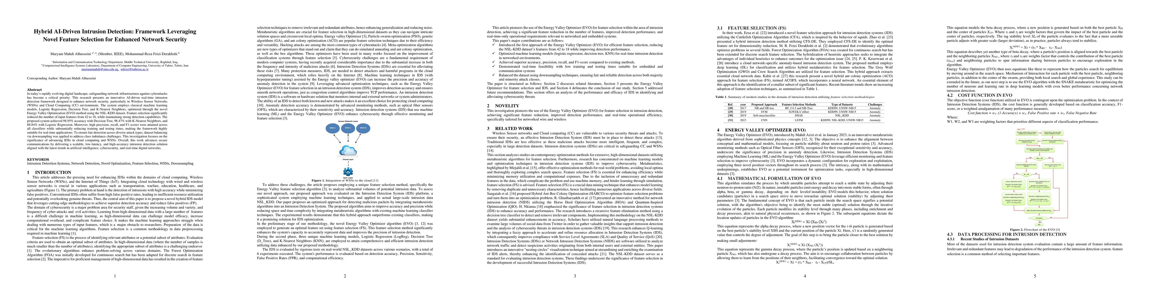 In today's rapidly evolving digital landscape, safeguarding network infrastructures against cyberattacks has become a critical priority. This research presents an innovative AI-driven real-time intrusion detection framework designed to enhance network security, particularly in Wireless Sensor Networks (WSNs) and Cloud Computing (CC) environments. The system employs classical machine learning models, Logistic Regression, Decision Tree, and K-Nearest Neighbors, optimized through the novel Energy Valley Optimization (EVO) method using the NSL-KDD dataset. Feature selection significantly reduced the number of input features from 42 to 18 while maintaining strong detection capabilities. The proposed system achieved 98.95 percent accuracy with Decision Tree, 98.47 percent with K-Nearest Neighbors, and 88.84 percent with Logistic Regression. Moreover, high precision, recall, and F1-scores were attained across all classifiers while substantially reducing training and testing times, making the framework highly suitable for real-time applications. To ensure fair detection across diverse attack types, dataset balancing via downsampling was applied to address class imbalance challenges. This investigation focuses on the significance of advancing intrusion detection systems in cloud computing and WSNs. Overall, this work advances secure communications by delivering a scalable, low-latency, and high-accuracy intrusion detection solution aligned with the latest trends in artificial intelligence, cybersecurity, and real-time digital networks