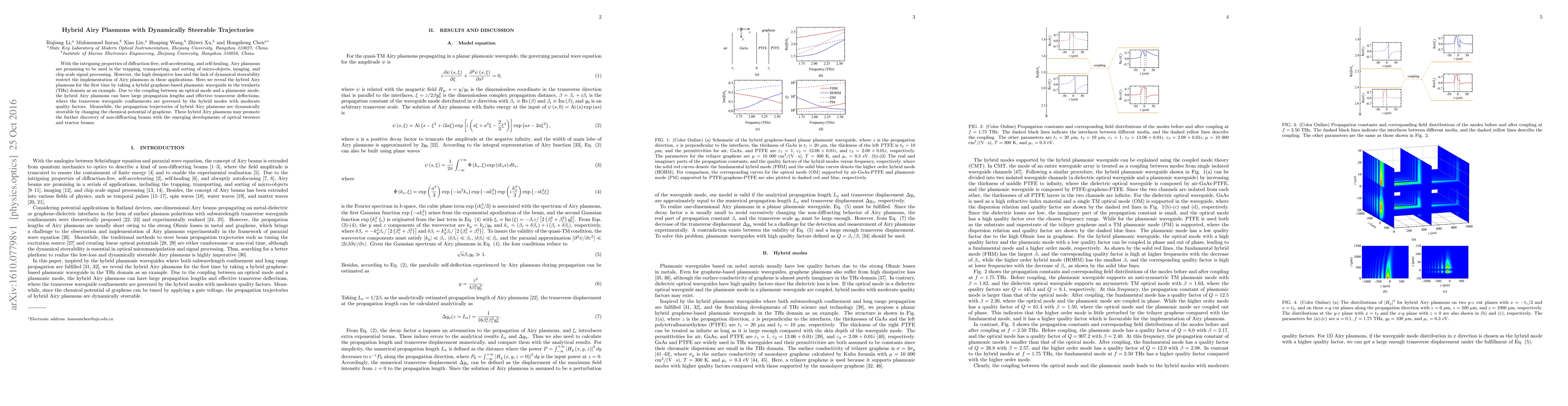 With the intriguing properties of diffraction-free, self-accelerating, and self-healing, Airy plasmons are promising to be used in the trapping, transporting, and sorting of micro-objects, imaging, and chip scale signal processing. However, the high dissipative loss and the lack of dynamical steerability restrict the implementation of Airy plasmons in these applications. Here we reveal the hybrid Airy plasmons for the first time by taking a hybrid graphene-based plasmonic waveguide in the terahertz (THz) domain as an example. Due to the coupling between an optical mode and a plasmonic mode, the hybrid Airy plasmons can have large propagation lengths and effective transverse deflections, where the transverse waveguide confinements are governed by the hybrid modes with moderate quality factors. Meanwhile, the propagation trajectories of hybrid Airy plasmons are dynamically steerable by changing the chemical potential of graphene. These hybrid Airy plasmons may promote the further discovery of non-diffracting beams with the emerging developments of optical tweezers and tractor beams.