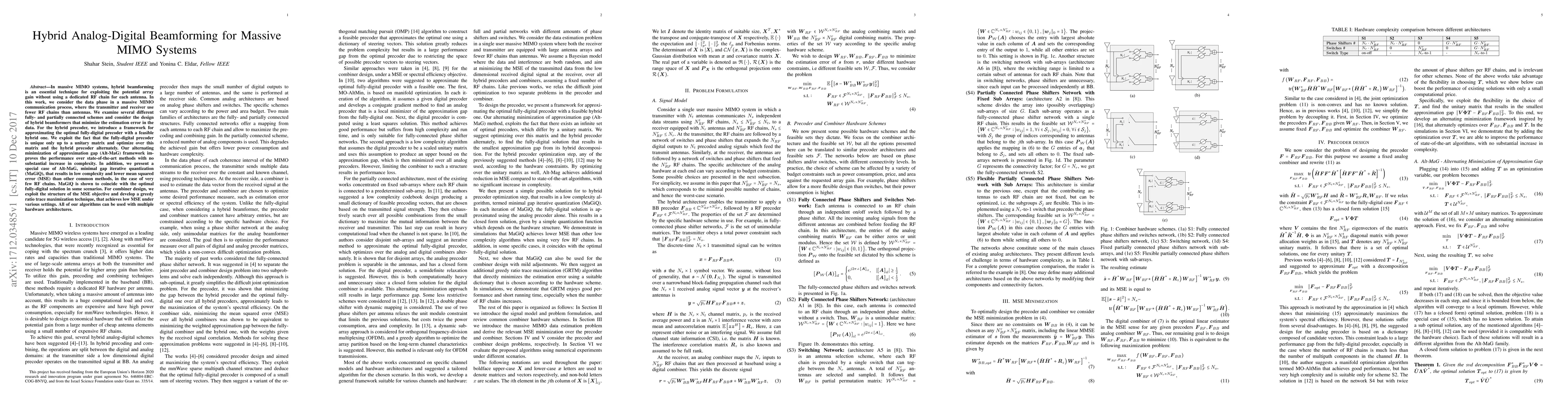 This paper proposes hybrid analog-digital beamforming techniques for massive MIMO systems to maximize array gain with limited RF chains. It introduces an Alt-MaG framework for optimizing hybrid precoders and presents a low-complexity MaGiQ method for scenarios with few RF chains, achieving lower mean squared error compared to other methods.