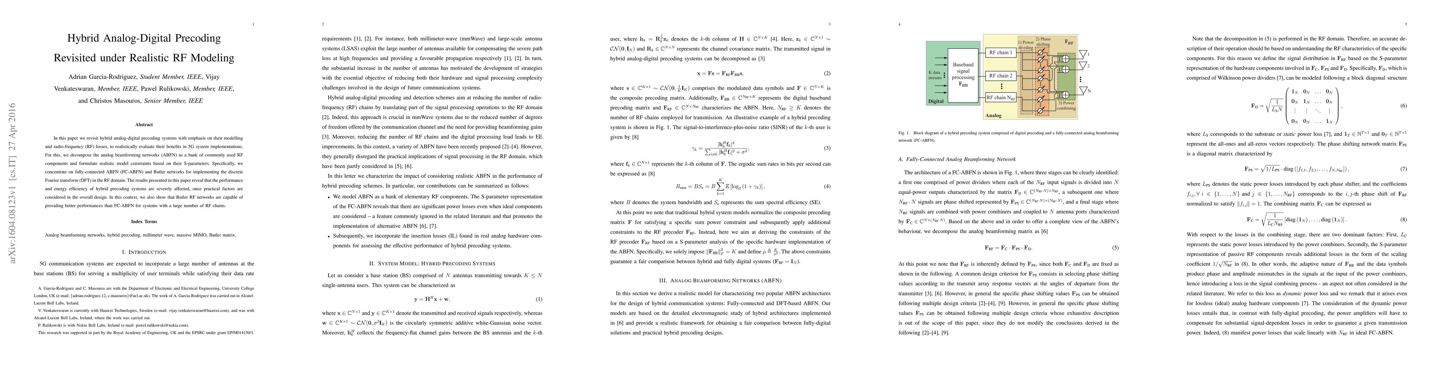 Hybrid analog-digital precoding systems for 5G face challenges when incorporating realistic RF modeling, affecting performance and energy efficiency. Butler networks outperform fully-connected ABFN in large-scale systems.