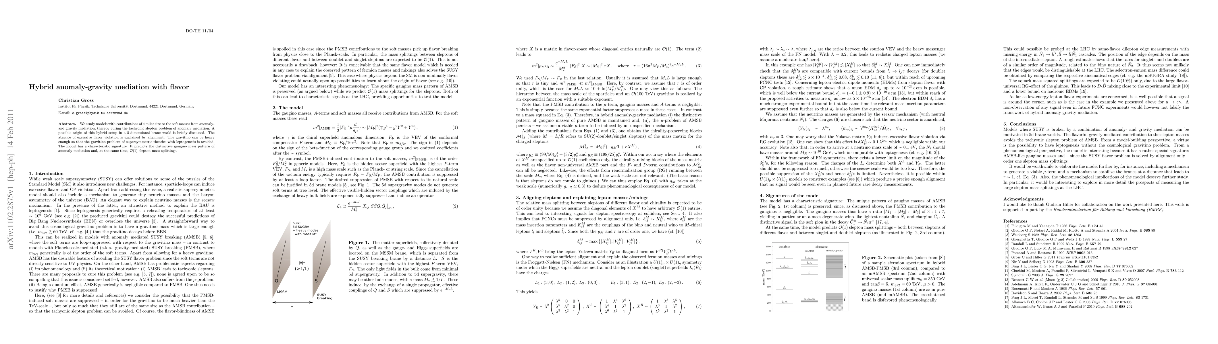We study models with contributions of similar size to the soft masses from anomaly- and gravity mediation, thereby curing the tachyonic slepton problem of anomaly mediation. A possible origin of this hybrid setup in a 5-dimensional brane world is briefly discussed. The absence of excessive flavor violation is explained by alignment. The gravitino can be heavy enough so that the gravitino problem of supersymmetric theories with leptogenesis is avoided. The model has a characteristic signature: It predicts the distinctive gaugino mass pattern of anomaly mediation and, at the same time, O(1) slepton mass splittings.
