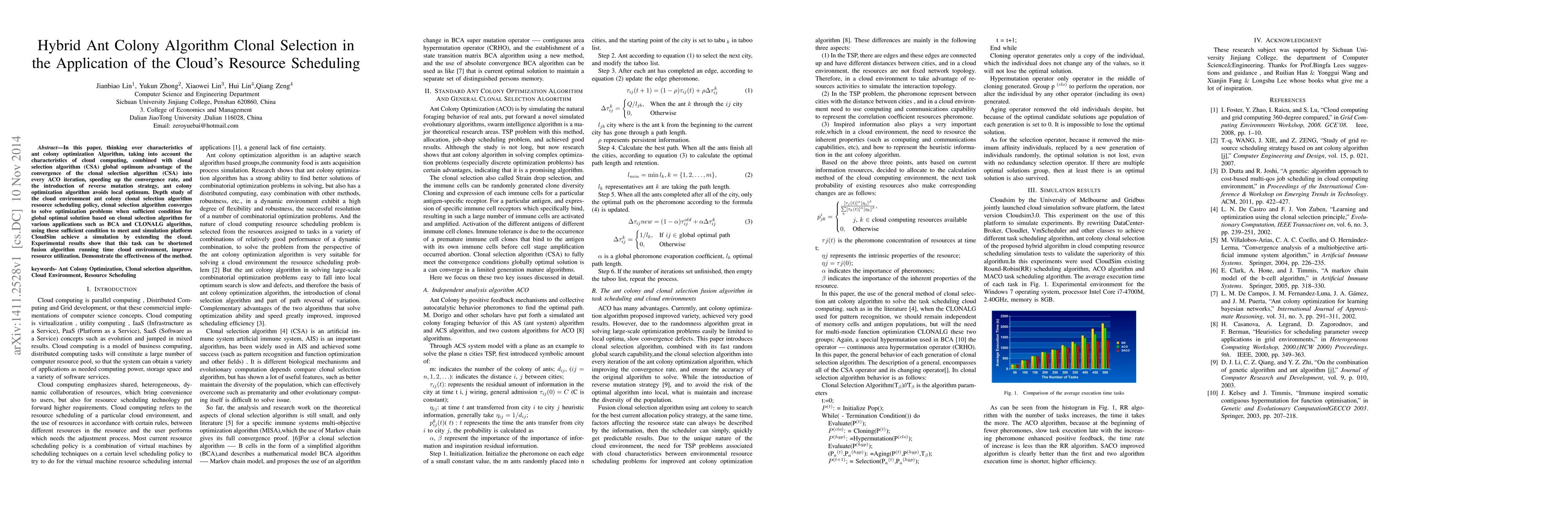 This paper proposes a hybrid ant colony optimization algorithm incorporating clonal selection to enhance cloud resource scheduling. The integration of clonal selection and reverse mutation strategies accelerates convergence and avoids local optima, improving resource utilization and reducing task execution time in cloud environments.