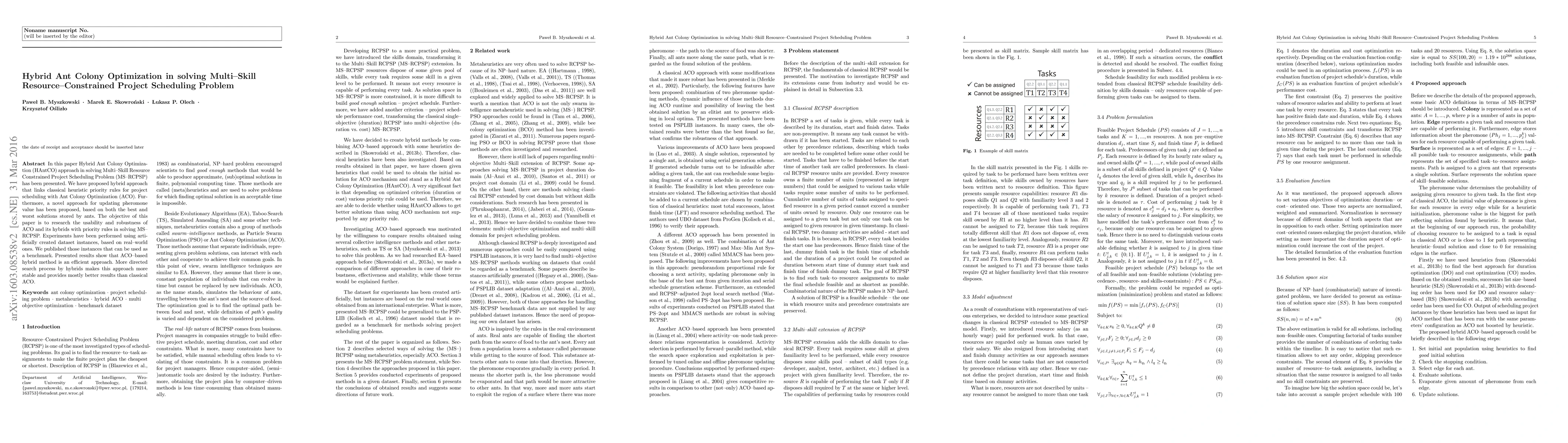 In this paper Hybrid Ant Colony Optimization (HAntCO) approach in solving Multi--Skill Resource Constrained Project Scheduling Problem (MS--RCPSP) has been presented. We have proposed hybrid approach that links classical heuristic priority rules for project scheduling with Ant Colony Optimization (ACO). Furthermore, a novel approach for updating pheromone value has been proposed, based on both the best and worst solutions stored by ants. The objective of this paper is to research the usability and robustness of ACO and its hybrids with priority rules in solving MS--RCPSP. Experiments have been performed using artificially created dataset instances, based on real--world ones. We published those instances that can be used as a benchmark. Presented results show that ACO--based hybrid method is an efficient approach. More directed search process by hybrids makes this approach more stable and provides mostly better results than classical ACO.