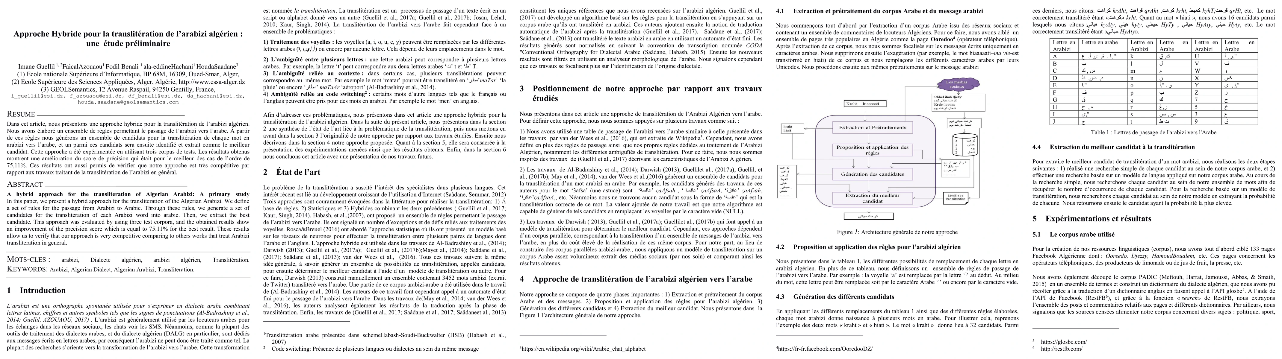A hybrid approach for the transliteration of Algerian Arabizi: A primary study In this paper, we present a hybrid approach for the transliteration of the Algerian Arabizi. We define a set of rules enable us the passage from Arabizi to Arabic. Through these rules, we generate a set of candidates for the transliteration of each Arabizi word into arabic. Then, we extract the best candidate. This approach was evaluated by using three test corpora, and the obtained results show an improvement of the precision score which is equal to 75.11% for the best result. These results allow us to verify that our approach is very competitive comparing to others works that treat Arabizi transliteration in general. Keywords: Arabizi, Dialecte Alg\'erien, Arabizi Alg\'erien, Translit\'eration.