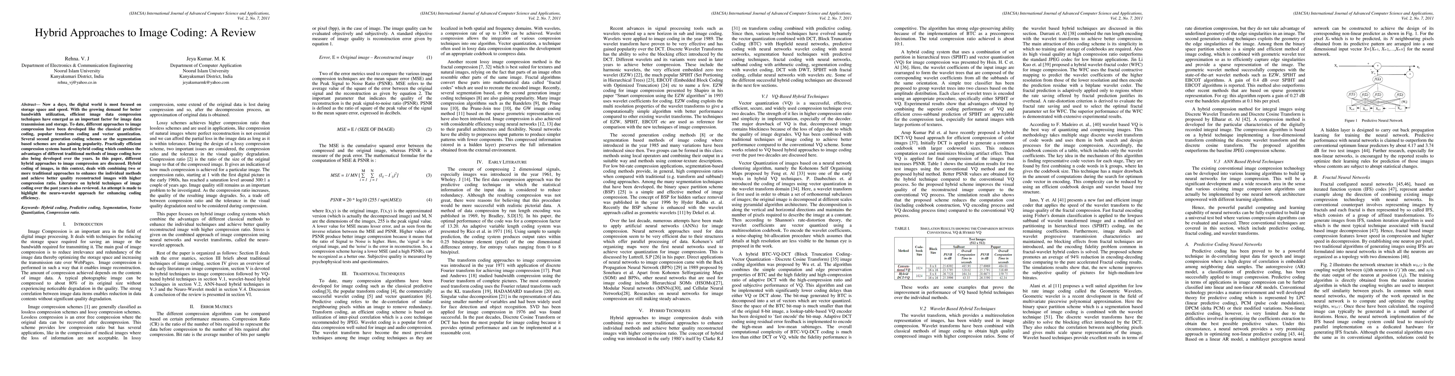 This paper reviews hybrid approaches to image coding, focusing on combining traditional methods like predictive coding, transform coding, and vector quantization to improve compression efficiency and image quality. It highlights the neuro-wavelet approach as a promising technique for enhancing coding efficiency.