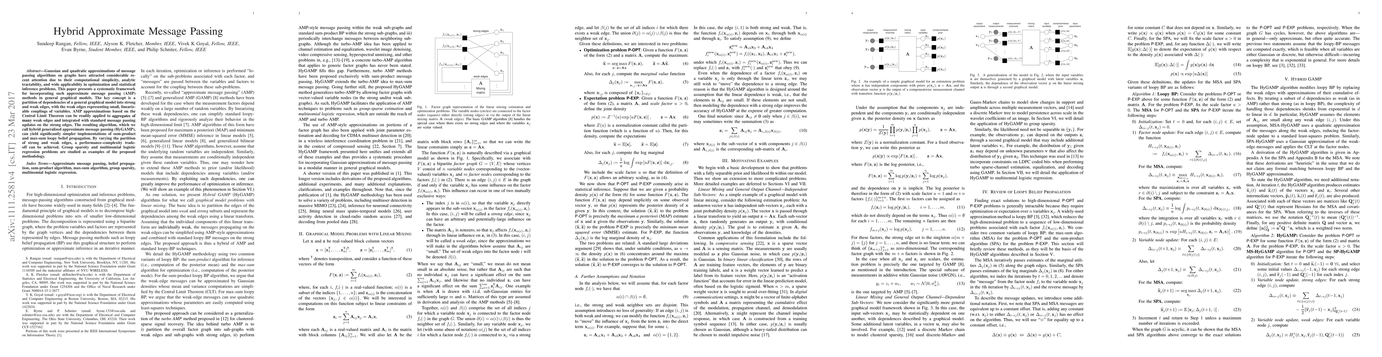 This paper introduces a framework for hybrid approximate message passing (HyGAMP) that combines Gaussian approximations for weak edges and standard message passing for strong edges in graphical models. HyGAMP simplifies implementation and offers a performance-complexity trade-off, demonstrated through applications in group sparsity and multinomial logistic regression.