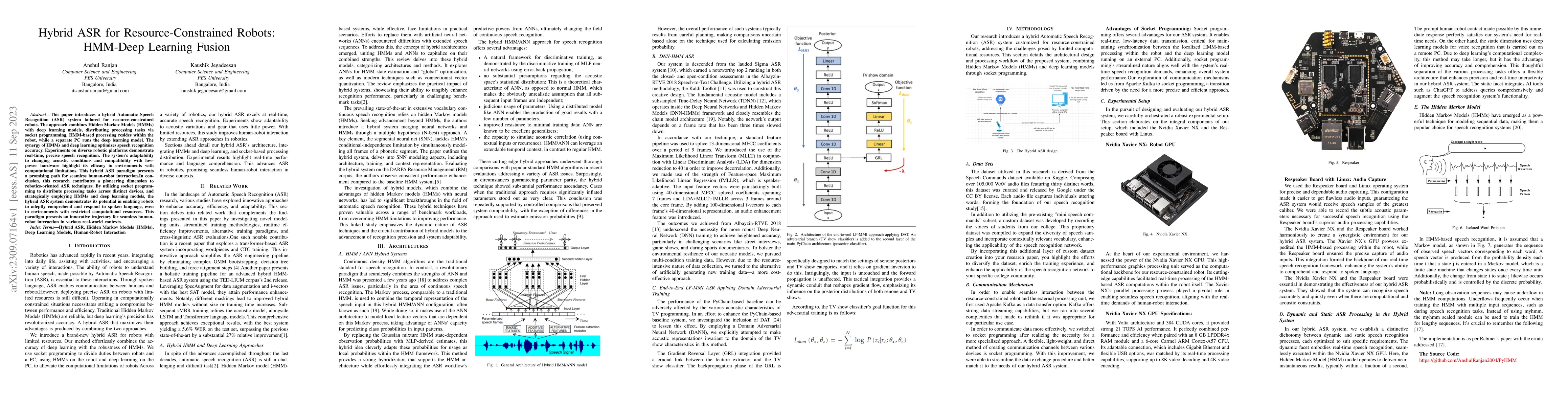 This paper presents a novel hybrid Automatic Speech Recognition (ASR) system designed specifically for resource-constrained robots. The proposed approach combines Hidden Markov Models (HMMs) with deep learning models and leverages socket programming to distribute processing tasks effectively. In this architecture, the HMM-based processing takes place within the robot, while a separate PC handles the deep learning model. This synergy between HMMs and deep learning enhances speech recognition accuracy significantly. We conducted experiments across various robotic platforms, demonstrating real-time and precise speech recognition capabilities. Notably, the system exhibits adaptability to changing acoustic conditions and compatibility with low-power hardware, making it highly effective in environments with limited computational resources. This hybrid ASR paradigm opens up promising possibilities for seamless human-robot interaction. In conclusion, our research introduces a pioneering dimension to ASR techniques tailored for robotics. By employing socket programming to distribute processing tasks across distinct devices and strategically combining HMMs with deep learning models, our hybrid ASR system showcases its potential to enable robots to comprehend and respond to spoken language adeptly, even in environments with restricted computational resources. This paradigm sets a innovative course for enhancing human-robot interaction across a wide range of real-world scenarios.