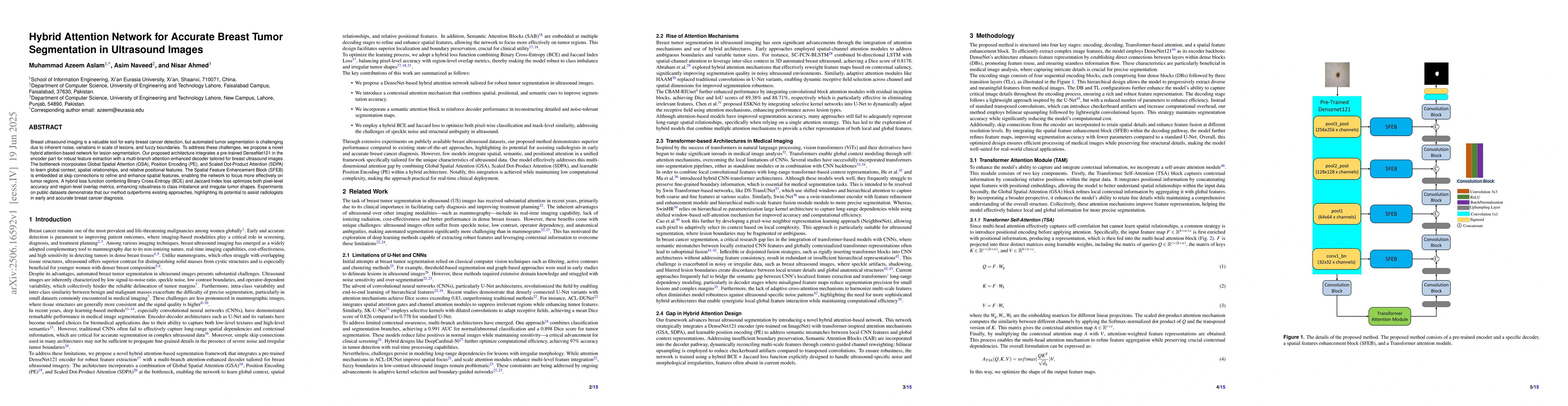 This research introduces a novel hybrid attention network for precise breast tumor segmentation in ultrasound images. The network, combining DenseNet121 for feature extraction and a multi-branch attention-enhanced decoder, outperforms existing methods on public datasets, potentially aiding radiologists in early and accurate breast cancer diagnosis.