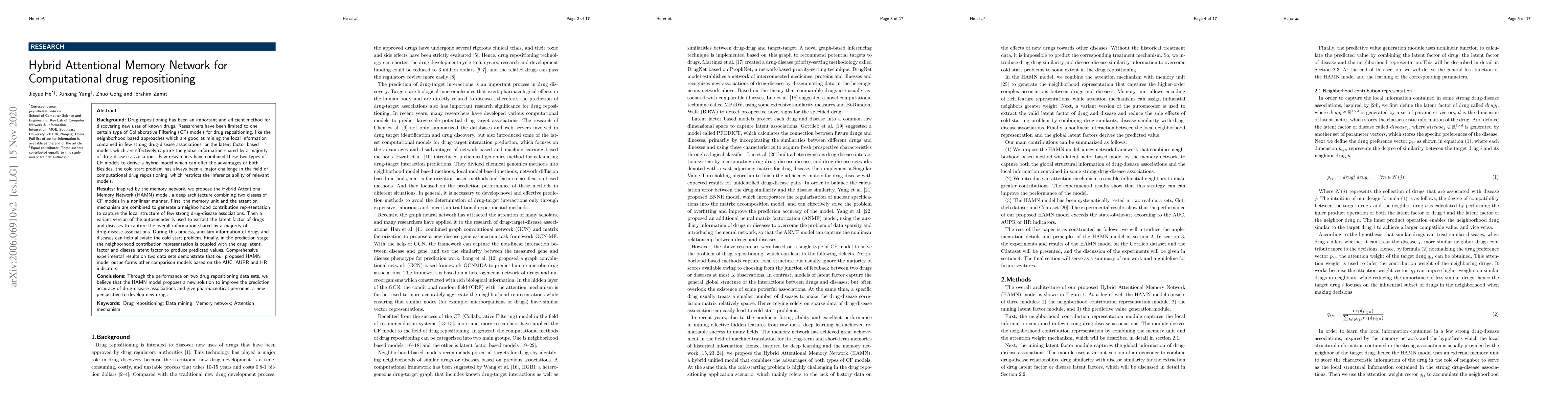 The paper proposes a Hybrid Attentional Memory Network (HAMN) model to enhance computational drug repositioning by combining collaborative filtering approaches to capture both local and global information. The model effectively addresses the cold start problem by integrating memory units and attention mechanisms, and it outperforms other methods based on AUC, AUPR, and HR metrics.