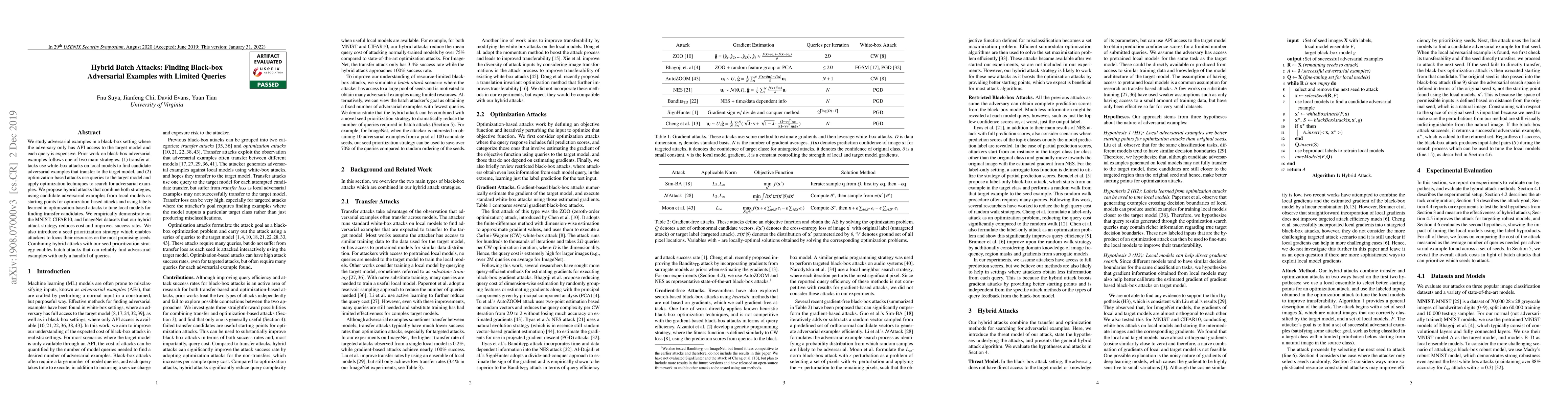 This paper proposes hybrid batch attacks to find adversarial examples in a black-box setting with limited and costly queries. The method combines transfer attacks and optimization-based attacks, improving efficiency and success rates, and introduces a seed prioritization strategy to focus resources on the most promising candidates.