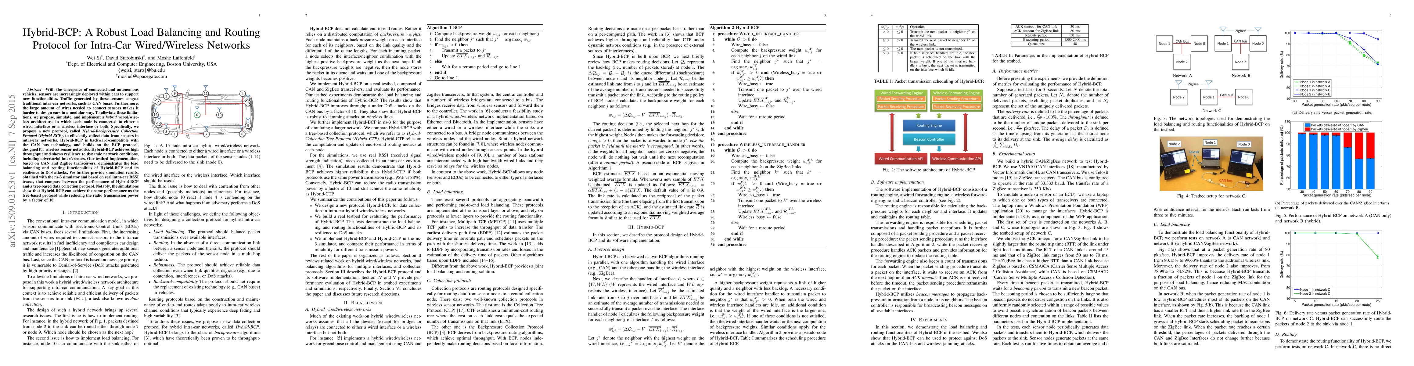 The paper proposes a Hybrid-Backpressure Collection Protocol (Hybrid-BCP) for efficient data collection in intra-car networks, combining wired and wireless interfaces to alleviate congestion and modular design issues. Simulation and implementation results show that Hybrid-BCP achieves high throughput and resilience, reducing transmission power by a factor of 10 compared to tree-based protocols.