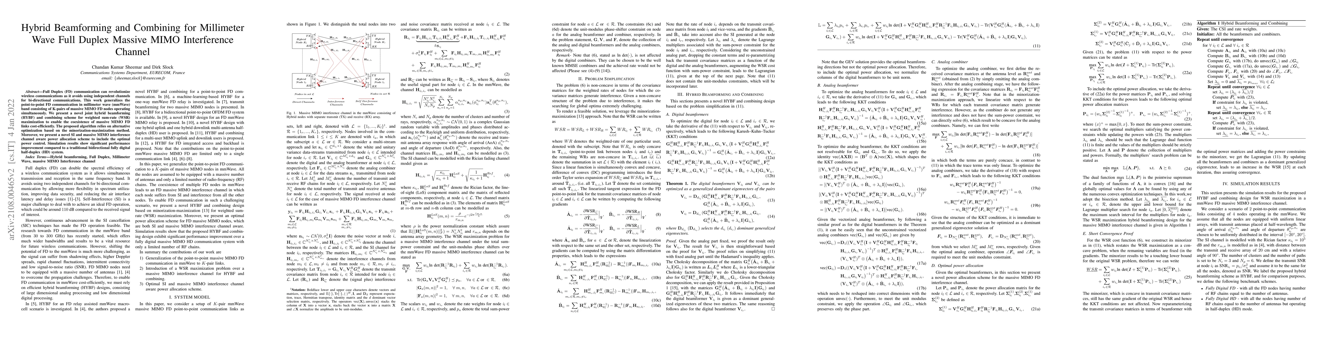 This paper proposes a hybrid beamforming and combining scheme for K-pairs of massive MIMO Full Duplex nodes in millimeter wave bands, aiming to maximize weighted sum-rate. The algorithm employs an alternative optimization method and includes a power allocation scheme for self-interference and interference management, demonstrating significant performance gains over traditional half-duplex systems.