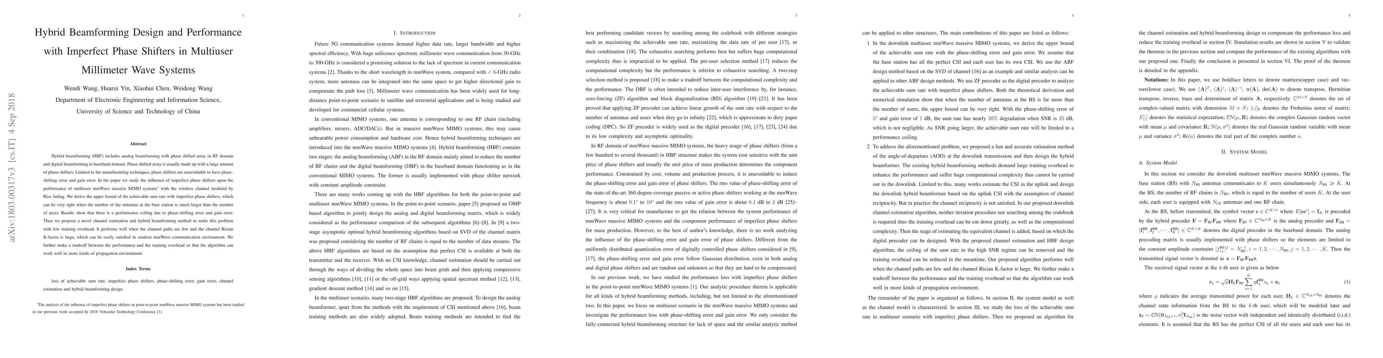 Hybrid beamforming (HBF) includes analog beamforming with phase shifted array in RF domain and digital beamforming in baseband domain. Phase shifted array is usually made up with a large amount of phase shifters. Limited to the manufacturing techniques, phase shifters are unavoidable to have phaseshifting error and gain error. In the paper we study the influence of imperfect phase shifters upon the performance of multiuser mmWave massive MIMO systems1 with the wireless channel modeled by Rice fading. We derive the upper bound of the achievable sum rate with imperfect phase shifters, which can be very tight when the number of the antennas at the base station is much larger than the number of users. Results show that there is a performance ceiling due to phase-shifting error and gain error. Then we propose a novel channel estimation and hybrid beamforming method to settle this problem with low training overhead. It performs well when the channel paths are few and the channel Rician K-factor is large, which can be easily satisfied in outdoor mmWave communication environment. We further make a tradeoff between the performance and the training overhead so that the algorithm can work well in more kinds of propagation environment.