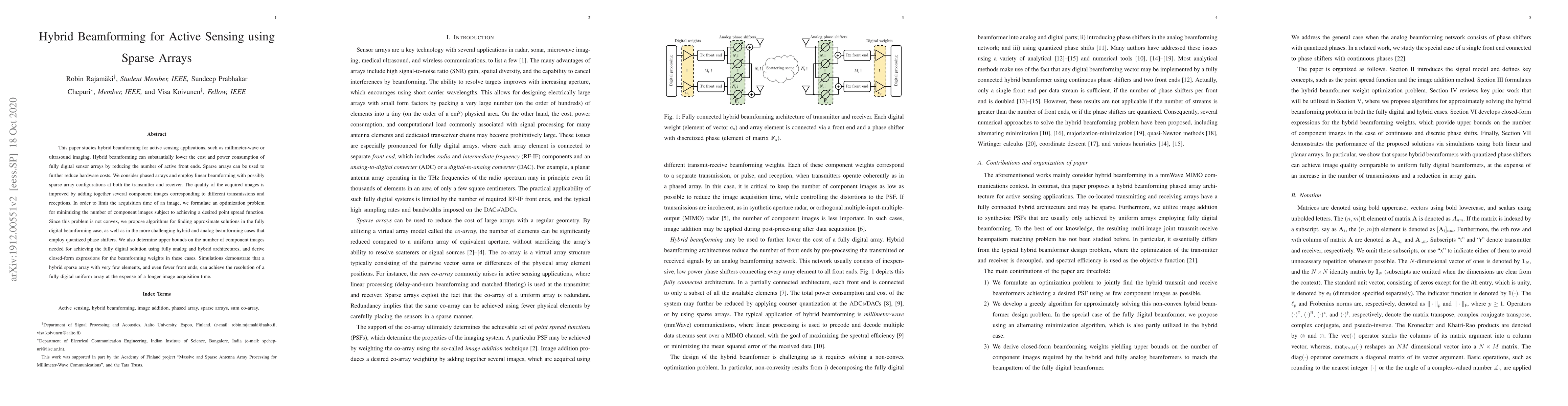 This paper studies hybrid beamforming for active sensing applications, such as millimeter-wave or ultrasound imaging. Hybrid beamforming can substantially lower the cost and power consumption of fully digital sensor arrays by reducing the number of active front ends. Sparse arrays can be used to further reduce hardware costs. We consider phased arrays and employ linear beamforming with possibly sparse array configurations at both the transmitter and receiver. The quality of the acquired images is improved by adding together several component images corresponding to different transmissions and receptions. In order to limit the acquisition time of an image, we formulate an optimization problem for minimizing the number of component images subject to achieving a desired point spread function. Since this problem is not convex, we propose algorithms for finding approximate solutions in the fully digital beamforming case, as well as in the more challenging hybrid and analog beamforming cases that employ quantized phase shifters. We also determine upper bounds on the number of component images needed for achieving the fully digital solution using fully analog and hybrid architectures, and derive closed-form expressions for the beamforming weights in these cases. Simulations demonstrate that a hybrid sparse array with very few elements, and even fewer front ends, can achieve the resolution of a fully digital uniform array at the expense of a longer image acquisition time.