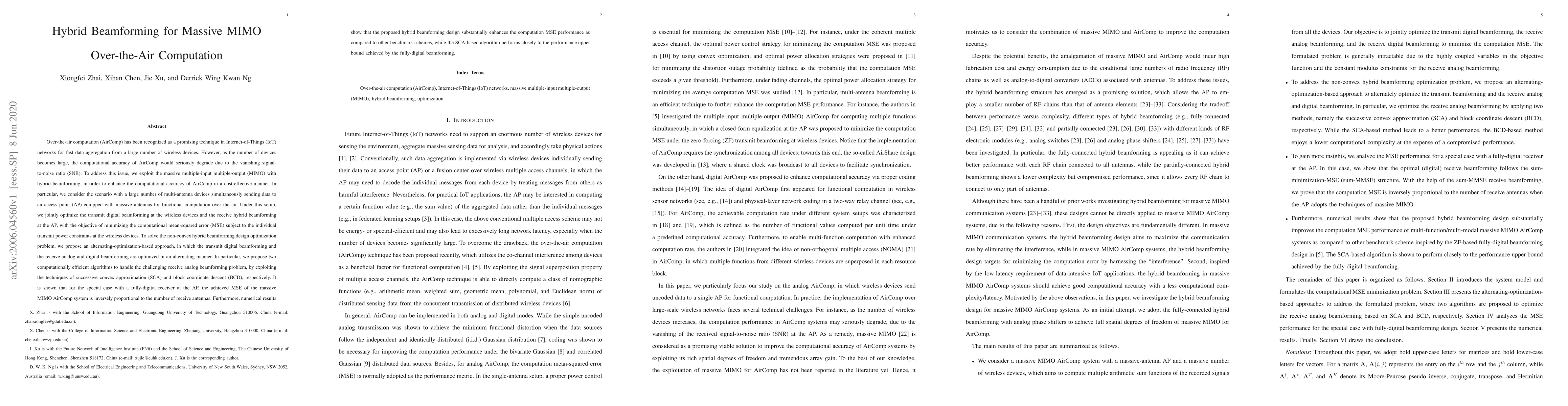 This paper explores hybrid beamforming in massive MIMO systems to enhance over-the-air computation accuracy in IoT networks, addressing the degradation in computational accuracy due to low SNR. The proposed alternating-optimization-based approach optimizes transmit and receive beamforming to minimize computational mean-squared error, demonstrating significant performance improvements over benchmark schemes.