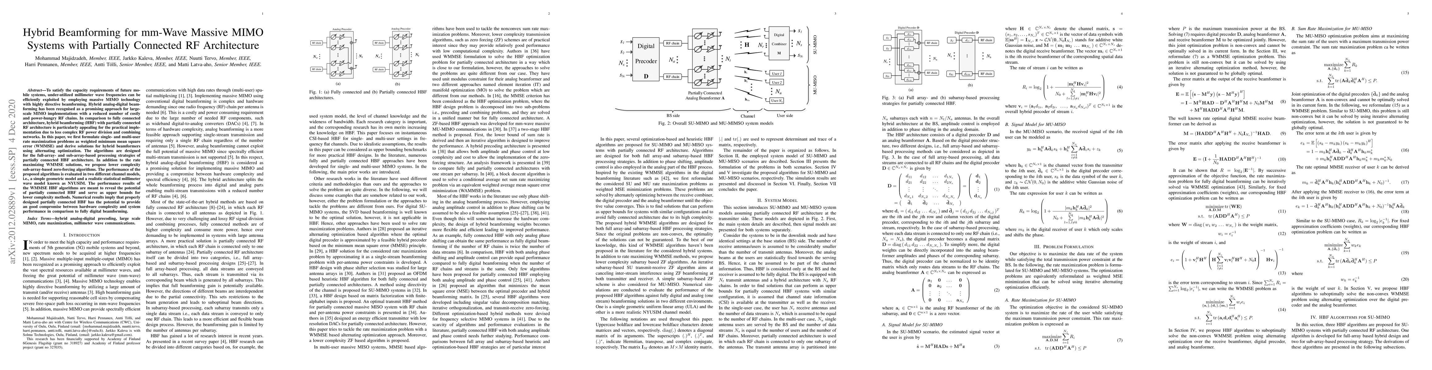 This paper proposes hybrid beamforming methods for millimeter wave massive MIMO systems using partially connected RF architectures to optimize capacity and reduce complexity. It formulates single- and multi-user rate maximization problems and derives solutions using weighted minimum mean square error (WMMSE) and zero-forcing algorithms, demonstrating performance in both geometric and statistical channel models.