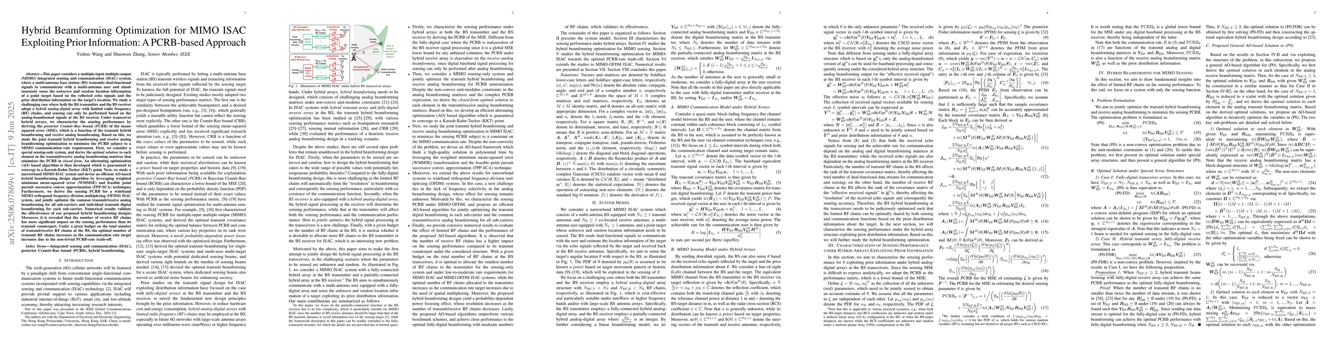 This paper considers a multiple-input multiple-output (MIMO) integrated sensing and communication (ISAC) system, where a multi-antenna base station (BS) with transceiver hybrid analog-digital arrays transmits dual-functional signals to communicate with a multi-antenna user and simultaneously sense the unknown and random location information of a target based on the reflected echo signals and the prior distribution information on the target's location. Under transceiver hybrid arrays, we characterize the sensing performance by deriving the posterior Cram\'{e}r-Rao bound (PCRB) of the mean-squared error which is a function of the transmit hybrid beamforming and receive analog beamforming. We study joint transmit hybrid beamforming and receive analog beamforming optimization to minimize the PCRB subject to a communication rate requirement. We first consider a sensing-only system and derive the optimal solution to each element in the transmit/receive analog beamforming matrices that minimizes the PCRB in closed form. Then, we develop an alternating optimization (AO) based algorithm. Next, we study a narrowband MIMO ISAC system and devise an efficient AO-based hybrid beamforming algorithm by leveraging weighted minimum mean-squared error and feasible point pursuit successive convex approximation methods. Furthermore, we extend the results for narrowband systems to a MIMO orthogonal frequency-division multiplexing (OFDM) ISAC system. Numerical results validate the effectiveness of our proposed hybrid beamforming designs. It is revealed that the number of receive RF chains has more significant impact on the sensing performance than its transmit counterpart. Under a given budget on the total number of transmit/receive RF chains at the BS, the optimal number of transmit RF chains increases as the communication rate target increases due to the non-trivial PCRB-rate trade-off.
