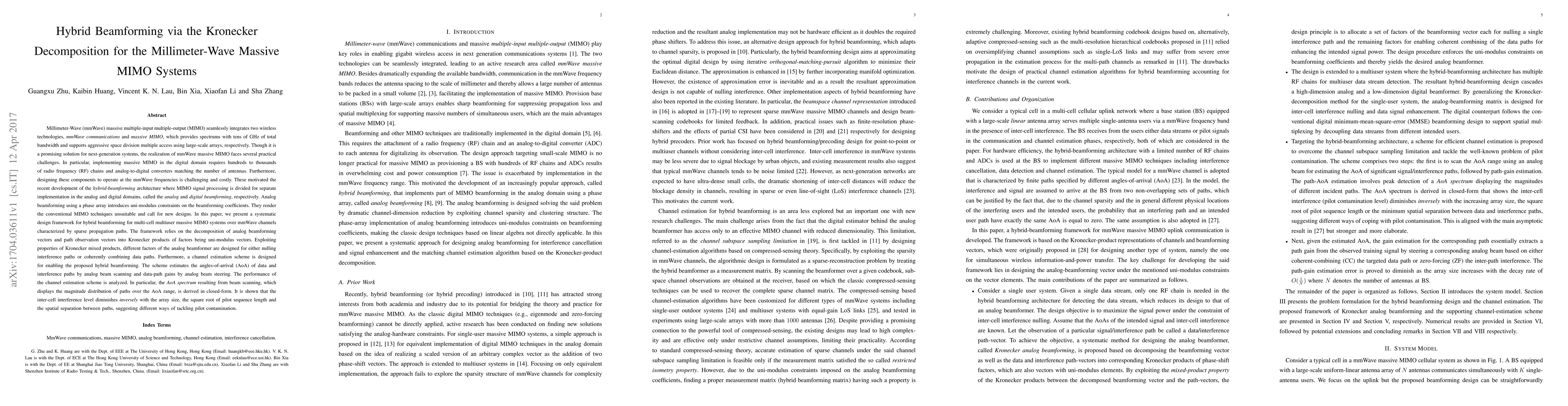 Despite its promising performance gain, the realization of mmWave massive MIMO still faces several practical challenges. In particular, implementing massive MIMO in the digital domain requires hundreds of RF chains matching the number of antennas. Furthermore, designing these components to operate at the mmWave frequencies is challenging and costly. These motivated the recent development of hybrid-beamforming where MIMO processing is divided for separate implementation in the analog and digital domains, called the analog and digital beamforming, respectively. Analog beamforming using a phase array introduces uni-modulus constraints on the beamforming coefficients, rendering the conventional MIMO techniques unsuitable and call for new designs. In this paper, we present a systematic design framework for hybrid beamforming for multi-cell multiuser massive MIMO systems over mmWave channels characterized by sparse propagation paths. The framework relies on the decomposition of analog beamforming vectors and path observation vectors into Kronecker products of factors being uni-modulus vectors. Exploiting properties of Kronecker mixed products, different factors of the analog beamformer are designed for either nulling interference paths or coherently combining data paths. Furthermore, a channel estimation scheme is designed for enabling the proposed hybrid beamforming. The scheme estimates the AoA of data and interference paths by analog beam scanning and data-path gains by analog beam steering. The performance of the channel estimation scheme is analyzed. In particular, the AoA spectrum resulting from beam scanning, which displays the magnitude distribution of paths over the AoA range, is derived in closed-form. It is shown that the inter-cell interference level diminishes inversely with the array size, the square root of pilot sequence length and the spatial separation between paths.