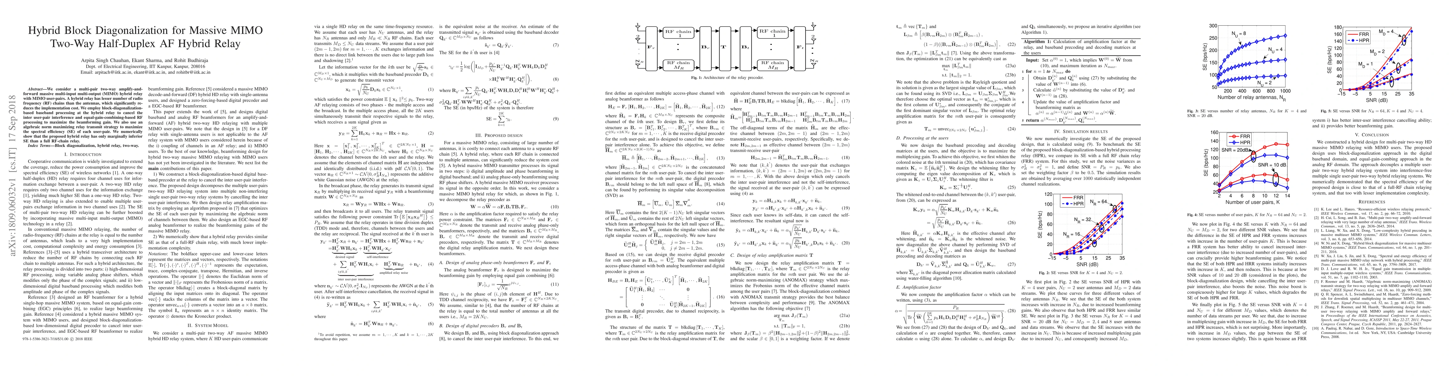 This paper proposes a hybrid relay scheme for massive MIMO two-way half-duplex amplify-and-forward communication, utilizing block-diagonalization for baseband processing to mitigate inter-user-pair interference and algebraic norm maximizing relay transmit strategy to enhance spectral efficiency. The hybrid relay achieves nearly equivalent performance compared to a full RF-chain relay.