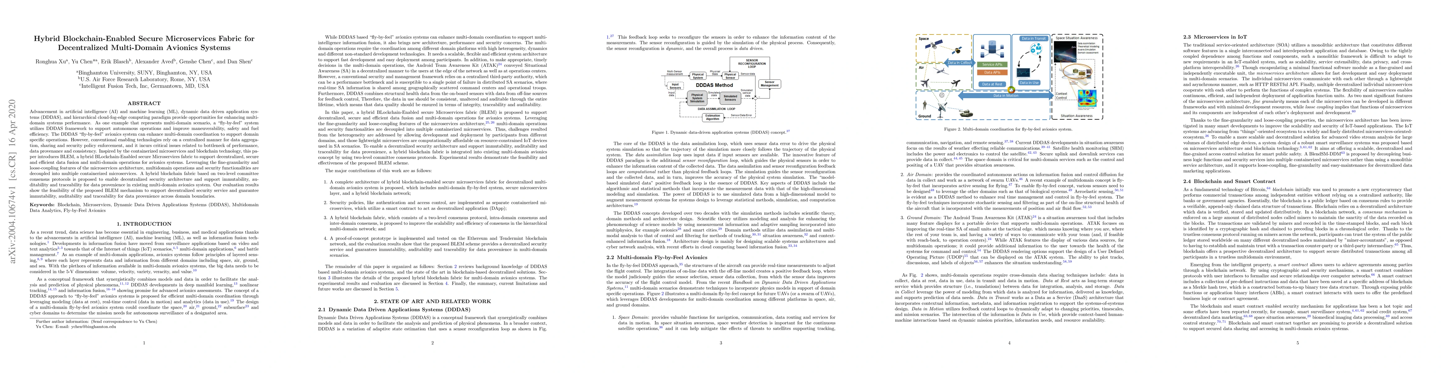 Advancement in artificial intelligence (AI) and machine learning (ML), dynamic data driven application systems (DDDAS), and hierarchical cloud-fog-edge computing paradigm provide opportunities for enhancing multi-domain systems performance. As one example that represents multi-domain scenario, a "fly-by-feel" system utilizes DDDAS framework to support autonomous operations and improve maneuverability, safety and fuel efficiency. The DDDAS "fly-by-feel" avionics system can enhance multi-domain coordination to support domain specific operations. However, conventional enabling technologies rely on a centralized manner for data aggregation, sharing and security policy enforcement, and it incurs critical issues related to bottleneck of performance, data provenance and consistency. Inspired by the containerized microservices and blockchain technology, this paper introduces BLEM, a hybrid BLockchain-Enabled secure Microservices fabric to support decentralized, secure and efficient data fusion and multi-domain operations for avionics systems. Leveraging the fine-granularity and loose-coupling features of the microservices architecture, multidomain operations and security functionalities are decoupled into multiple containerized microservices. A hybrid blockchain fabric based on two-level committee consensus protocols is proposed to enable decentralized security architecture and support immutability, auditability and traceability for data provenience in existing multi-domain avionics system. Our evaluation results show the feasibility of the proposed BLEM mechanism to support decentralized security service and guarantee immutability, auditability and traceability for data provenience across domain boundaries.