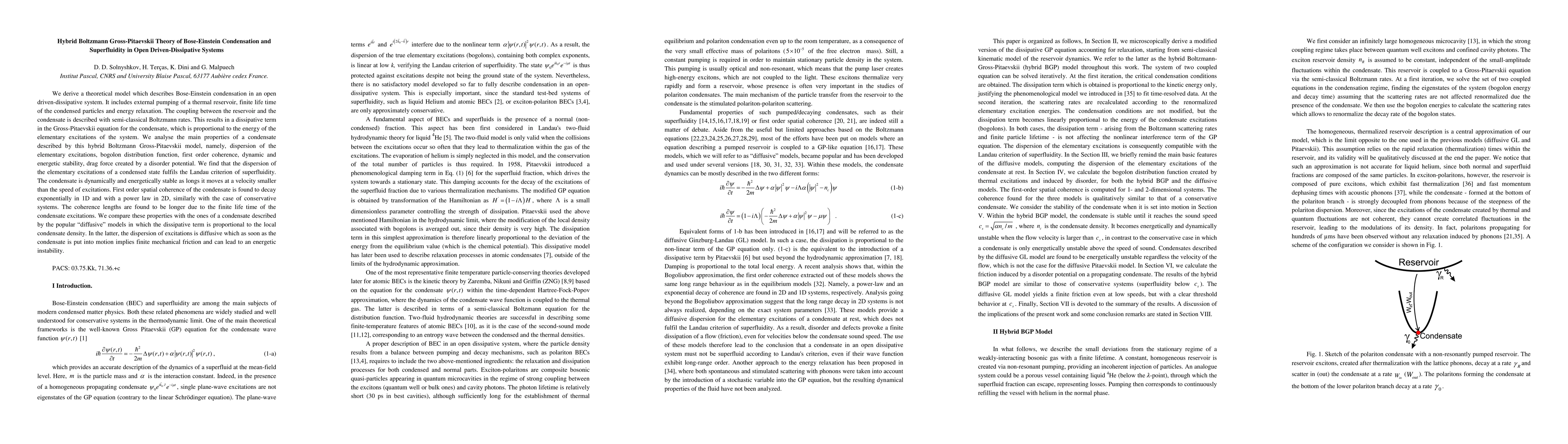 We derive a theoretical model which describes Bose-Einstein condensation in an open driven-dissipative system. It includes external pumping of a thermal reservoir, finite life time of the condensed particles and energy relaxation. The coupling between the reservoir and the condensate is described with semi-classical Boltzmann rates. This results in a dissipative term in the Gross-Pitaevskii equation for the condensate, which is proportional to the energy of the elementary excitations of the system. We analyse the main properties of a condensate described by this hybrid Boltzmann Gross-Pitaevskii model, namely, dispersion of the elementary excitations, bogolon distribution function, first order coherence, dynamic and energetic stability, drag force created by a disorder potential. We find that the dispersion of the elementary excitations of a condensed state fulfils the Landau criterion of superfluidity. The condensate is dynamically and energetically stable as longs it moves at a velocity smaller than the speed of excitations. First order spatial coherence of the condensate is found to decay exponentially in 1D and with a power law in 2D, similarly with the case of conservative systems. The coherence lengths are found to be longer due to the finite life time of the condensate excitations. We compare these properties with the ones of a condensate described by the popular "diffusive" models in which the dissipative term is proportional to the local condensate density. In the latter, the dispersion of excitations is diffusive which as soon as the condensate is put into motion implies finite mechanical friction and can lead to an energetic instability.
