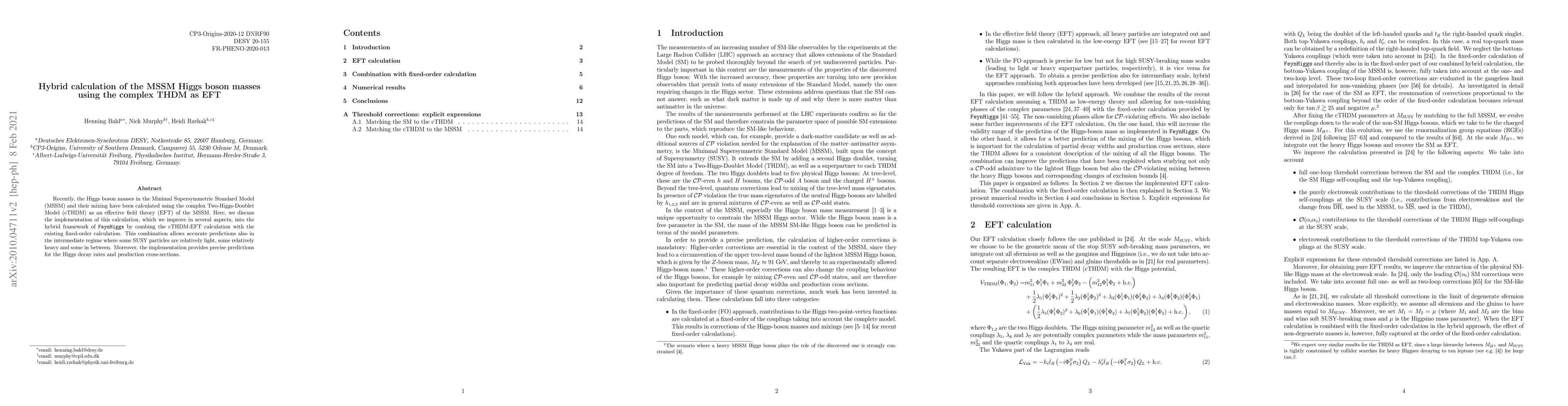Recently, the Higgs boson masses in the Minimal Supersymmetric Standard Model (MSSM) and their mixing have been calculated using the complex Two-Higgs-DoubletModel (cTHDM) as an effective field theory (EFT) of the MSSM. Here, we discuss the implementation of this calculation, which we improve in several aspects, into the hybrid framework of FeynHiggs by combing the cTHDM-EFT calculation with the existing fixed-order calculation. This combination allows accurate predictions also in the intermediate regime where some SUSY particles are relatively light, some relatively heavy and some in between. Moreover, the implementation provides precise predictions for the Higgs decay rates and production cross-sections.