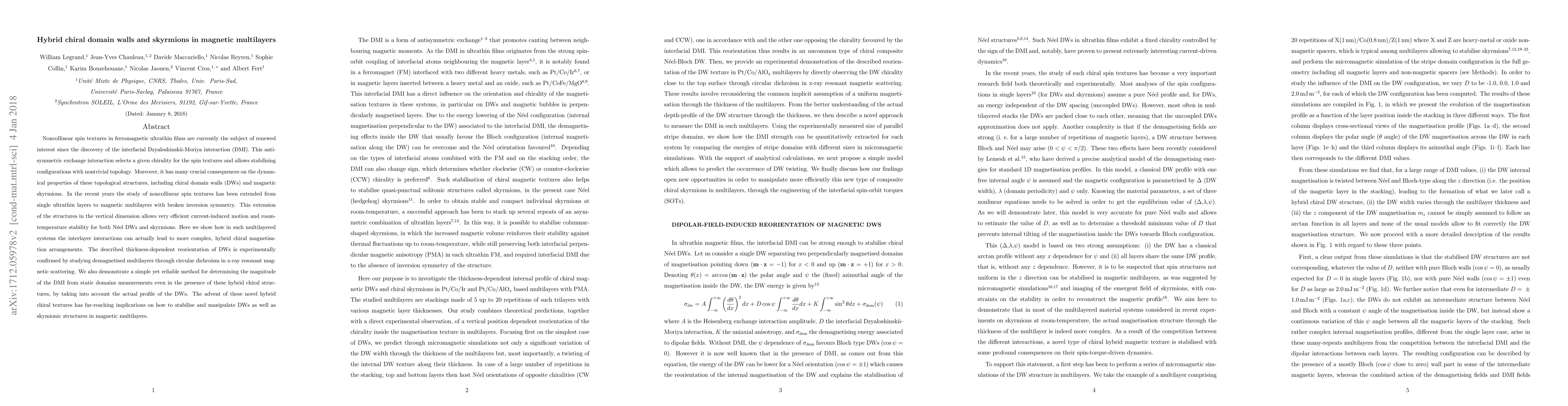 This paper explores the stabilization and dynamics of hybrid chiral domain walls and skyrmions in magnetic multilayers enabled by the Dzyaloshinskii-Moriya interaction. Experimental observations using x-ray resonant magnetic scattering confirm the thickness-dependent reorientation of these structures, and a method for measuring the DMI in the presence of hybrid chiral textures is proposed.