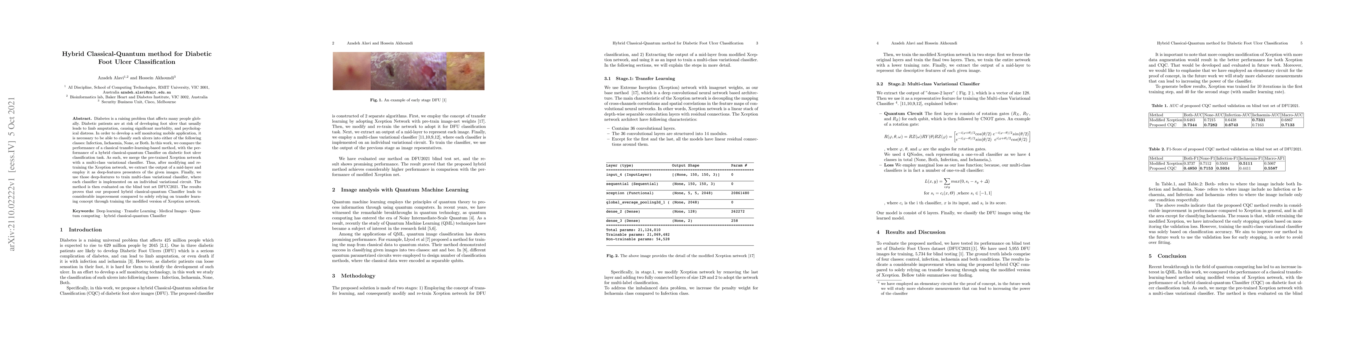 Diabetes is a raising problem that affects many people globally. Diabetic patients are at risk of developing foot ulcer that usually leads to limb amputation, causing significant morbidity, and psychological distress. In order to develop a self monitoring mobile application, it is necessary to be able to classify such ulcers into either of the following classes: Infection, Ischaemia, None, or Both. In this work, we compare the performance of a classical transfer-learning-based method, with the performance of a hybrid classical-quantum Classifier on diabetic foot ulcer classification task. As such, we merge the pre-trained Xception network with a multi-class variational classifier. Thus, after modifying and re-training the Xception network, we extract the output of a mid-layer and employ it as deep-features presenters of the given images. Finally, we use those deep-features to train multi-class variational classifier, where each classifier is implemented on an individual variational circuit. The method is then evaluated on the blind test set DFUC2021. The results proves that our proposed hybrid classical-quantum Classifier leads to considerable improvement compared to solely relying on transfer learning concept through training the modified version of Xception network.