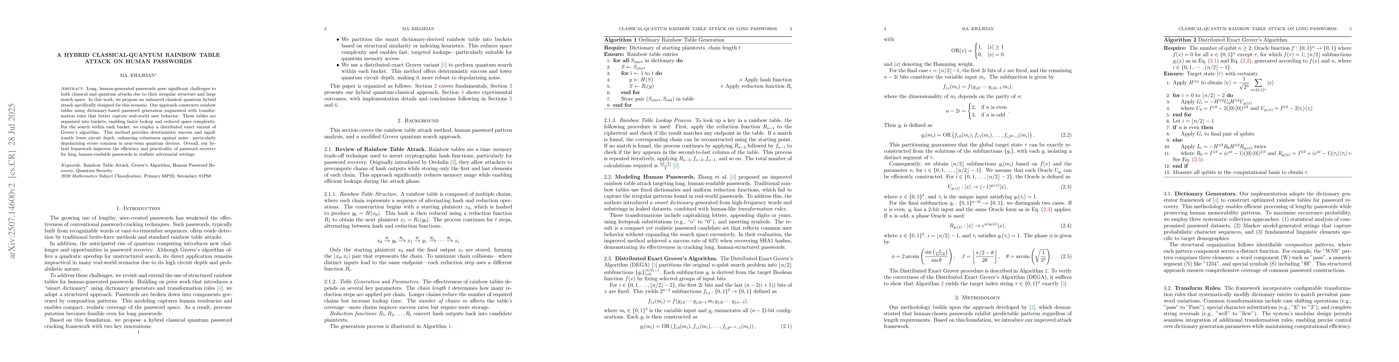 Passwords that are long and human-generated pose a challenge for both classical and quantum attacks due to their irregular structure and large search space. In this work, we present an enhanced classical-quantum hybrid attack tailored to this scenario. We build rainbow tables using dictionary-based password generation with transformation rules to better model real user behavior. These tables are then organized into buckets, enabling faster lookup and reduced space complexity. To perform quantum search within each bucket, we use a distributed exact variant of Grover's algorithm, which offers lower circuit depth and deterministic success. As a result, the overall quantum circuit is shallower and more robust against noise, particularly from depolarizing channels commonly found in near-term quantum devices. Through this work, Overall, we propose a hybrid framework that combines structured rainbow tables with efficient quantum search to enhance password recovery.