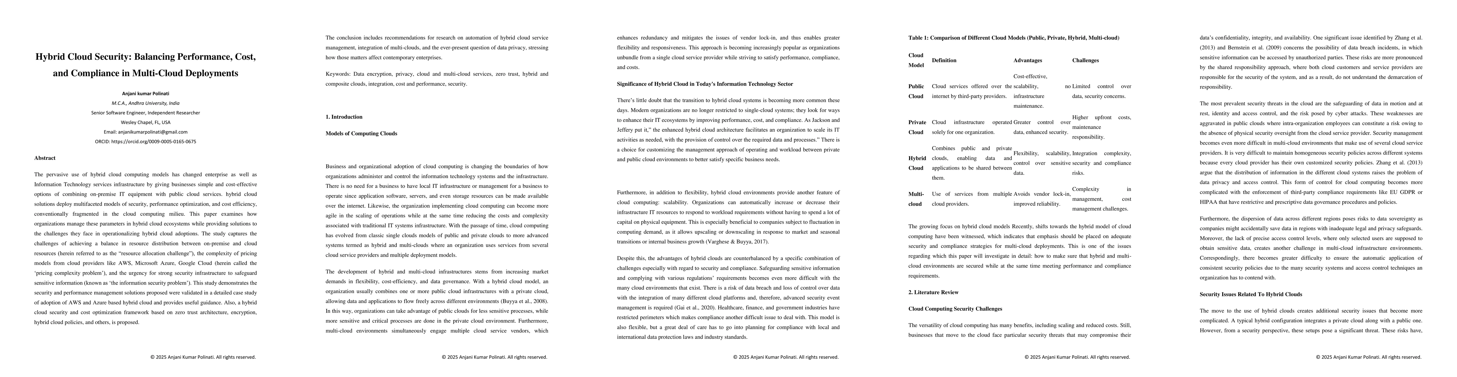 This paper explores how organizations balance performance, cost, and compliance in hybrid cloud deployments, offering a framework for security and cost optimization and recommendations for future research.