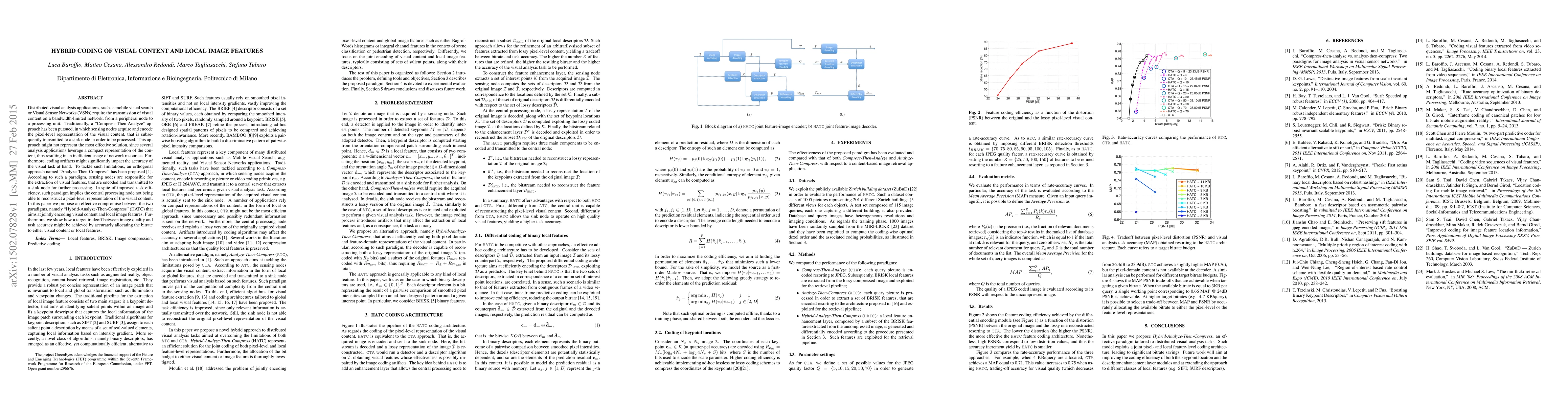 Distributed visual analysis applications, such as mobile visual search or Visual Sensor Networks (VSNs) require the transmission of visual content on a bandwidth-limited network, from a peripheral node to a processing unit. Traditionally, a Compress-Then-Analyze approach has been pursued, in which sensing nodes acquire and encode the pixel-level representation of the visual content, that is subsequently transmitted to a sink node in order to be processed. This approach might not represent the most effective solution, since several analysis applications leverage a compact representation of the content, thus resulting in an inefficient usage of network resources. Furthermore, coding artifacts might significantly impact the accuracy of the visual task at hand. To tackle such limitations, an orthogonal approach named Analyze-Then-Compress has been proposed. According to such a paradigm, sensing nodes are responsible for the extraction of visual features, that are encoded and transmitted to a sink node for further processing. In spite of improved task efficiency, such paradigm implies the central processing node not being able to reconstruct a pixel-level representation of the visual content. In this paper we propose an effective compromise between the two paradigms, namely Hybrid-Analyze-Then-Compress (HATC) that aims at jointly encoding visual content and local image features. Furthermore, we show how a target tradeoff between image quality and task accuracy might be achieved by accurately allocating the bitrate to either visual content or local features.