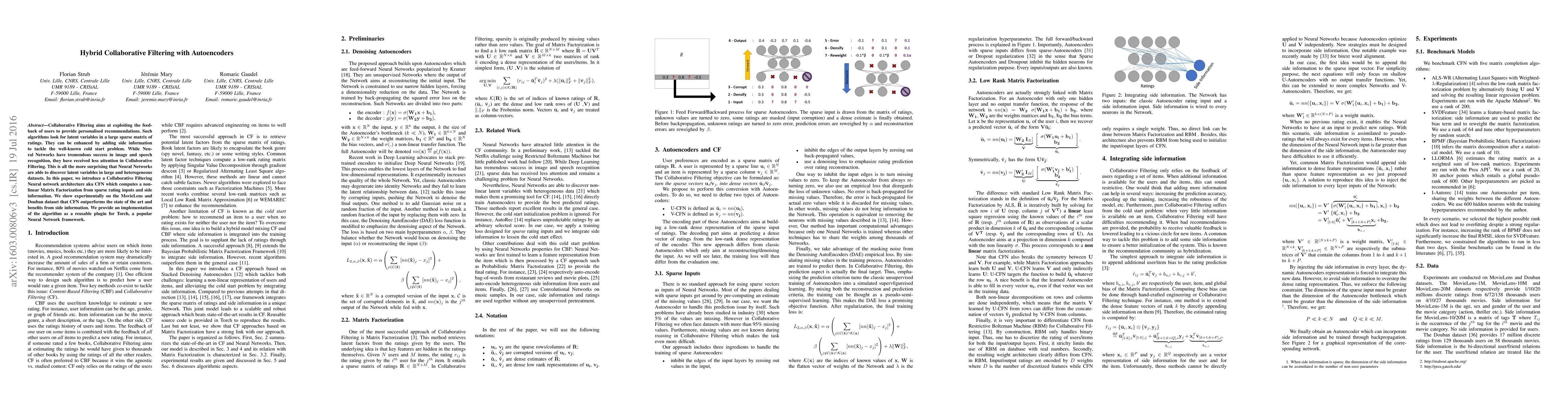 Collaborative Filtering aims at exploiting the feedback of users to provide personalised recommendations. Such algorithms look for latent variables in a large sparse matrix of ratings. They can be enhanced by adding side information to tackle the well-known cold start problem. While Neu-ral Networks have tremendous success in image and speech recognition, they have received less attention in Collaborative Filtering. This is all the more surprising that Neural Networks are able to discover latent variables in large and heterogeneous datasets. In this paper, we introduce a Collaborative Filtering Neural network architecture aka CFN which computes a non-linear Matrix Factorization from sparse rating inputs and side information. We show experimentally on the MovieLens and Douban dataset that CFN outper-forms the state of the art and benefits from side information. We provide an implementation of the algorithm as a reusable plugin for Torch, a popular Neural Network framework.