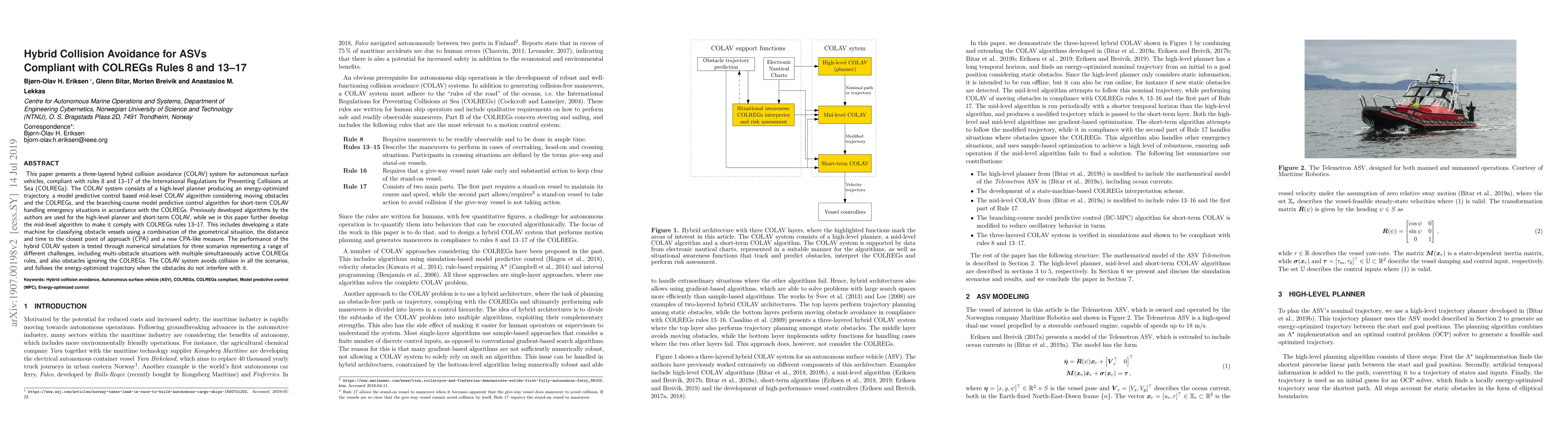 This paper introduces a three-layered hybrid collision avoidance system for autonomous surface vehicles, ensuring compliance with COLREGs rules 8 and 13-17. The system combines an energy-optimized trajectory planner, a model predictive control algorithm for mid-level avoidance, and a short-term emergency handling algorithm, successfully navigating complex multi-obstacle scenarios while adhering to maritime collision regulations.