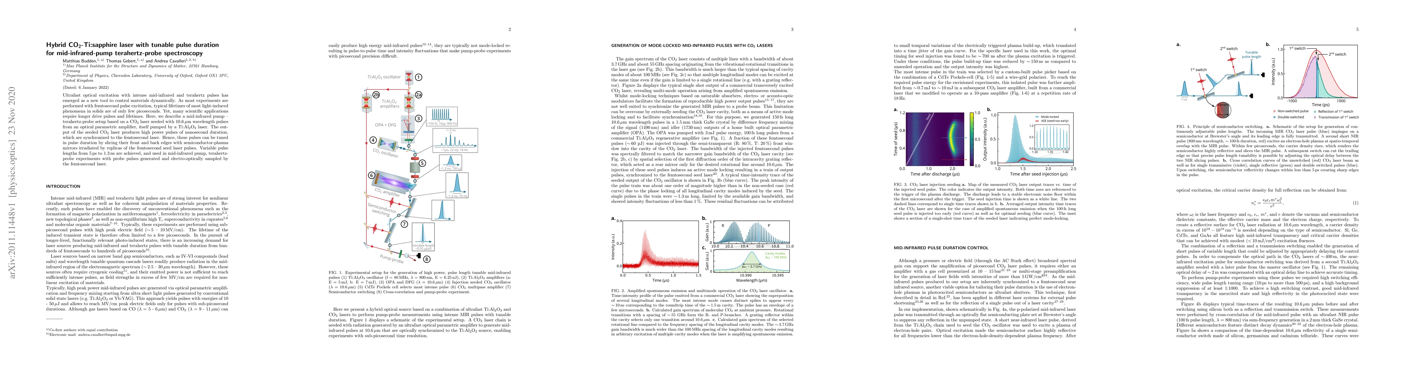 This paper presents a hybrid CO$_2$-Ti:sapphire laser system that generates tunable, nanosecond-duration mid-infrared pump pulses synchronized with femtosecond terahertz-probe pulses for dynamic material control experiments. The system allows for pulse durations from 5 ps to 1.3 ns, enabling studies of longer-lived phenomena in solids.
